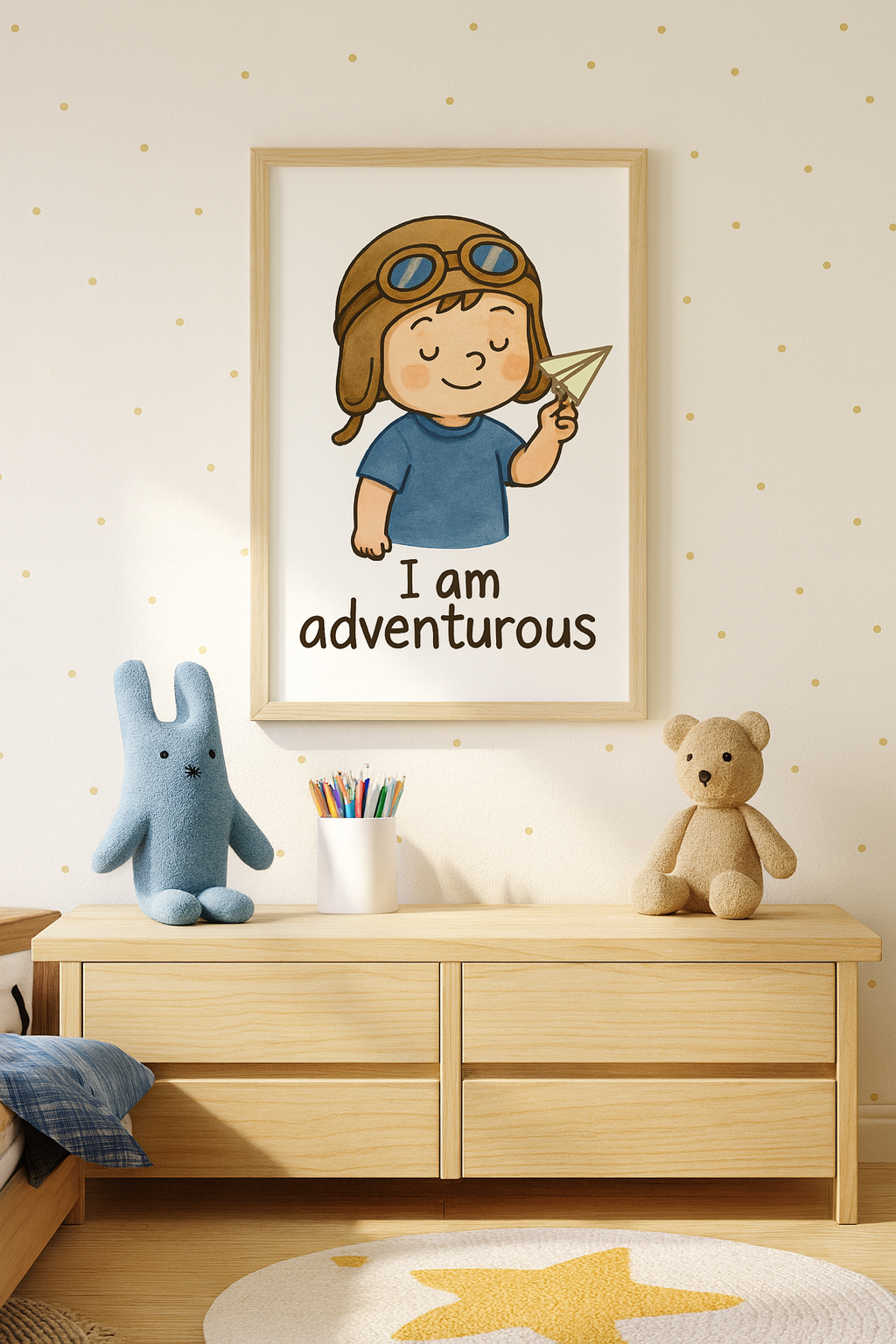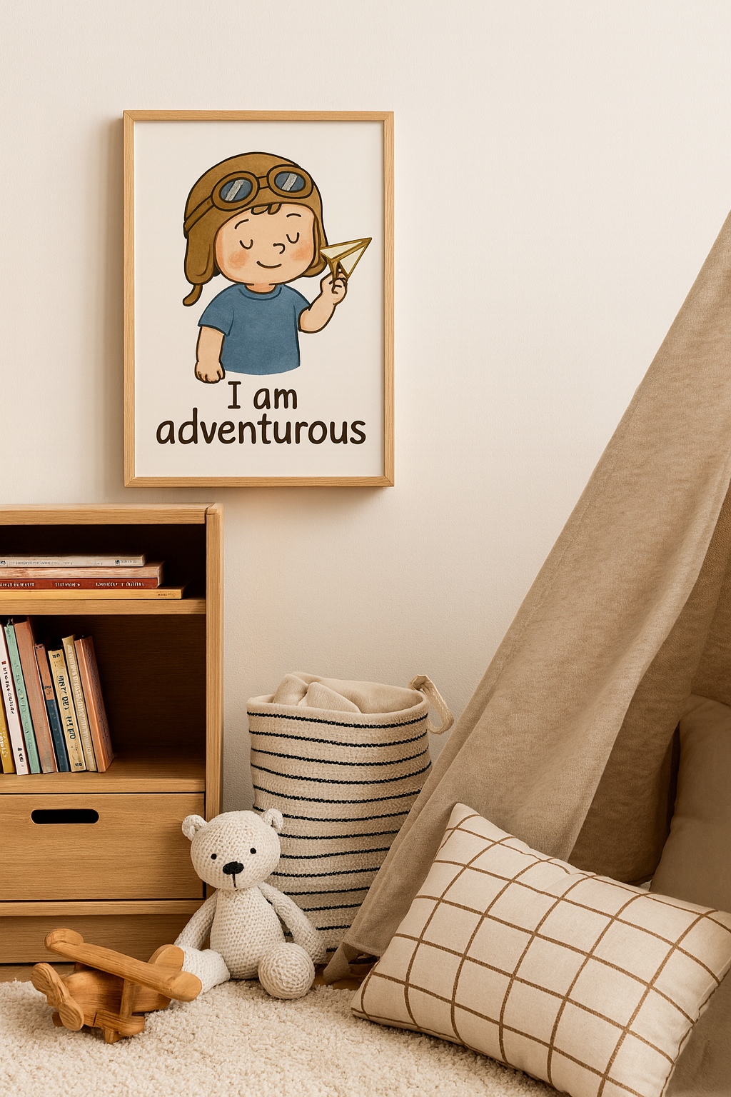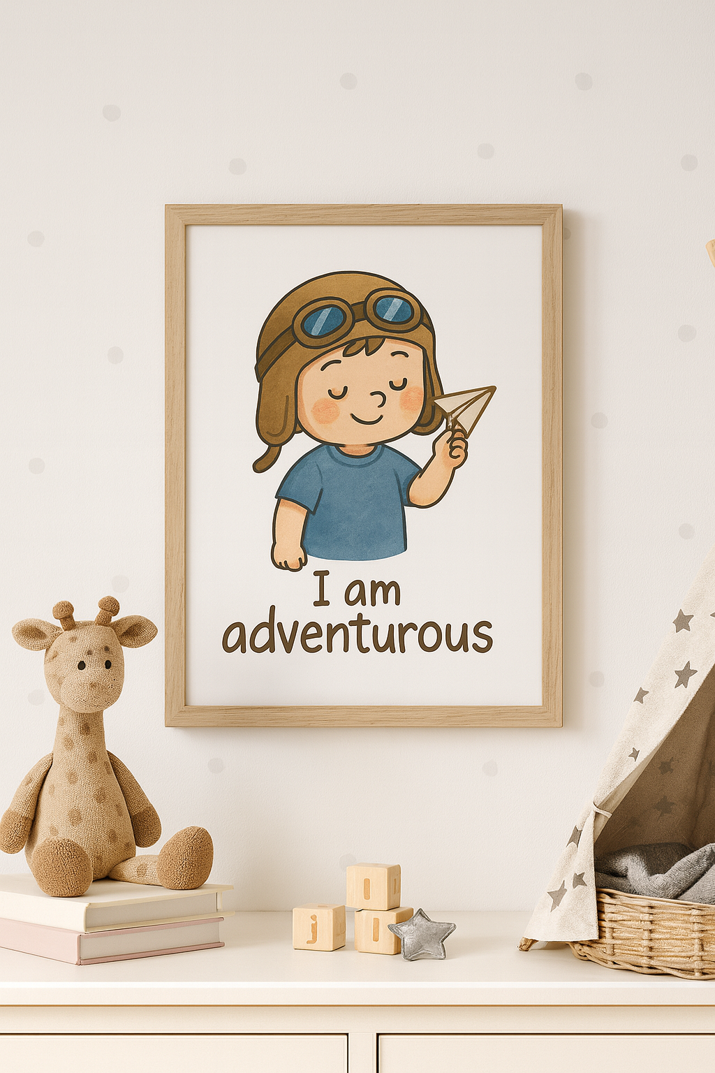 Inspire courage and curiosity with this charming “I am adventurous” poster! Featuring a playful little pilot holding a paper airplane, this print encourages kids to explore, imagine, and embrace new adventures every day. Perfect for nurseries, playrooms, or study corners, it’s a daily reminder that the world is full of exciting opportunities waiting to be discovered.