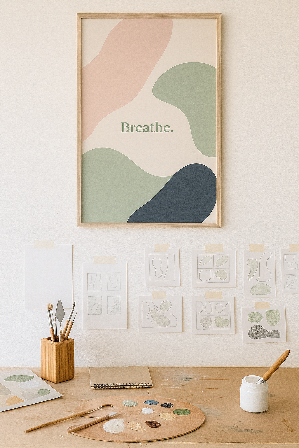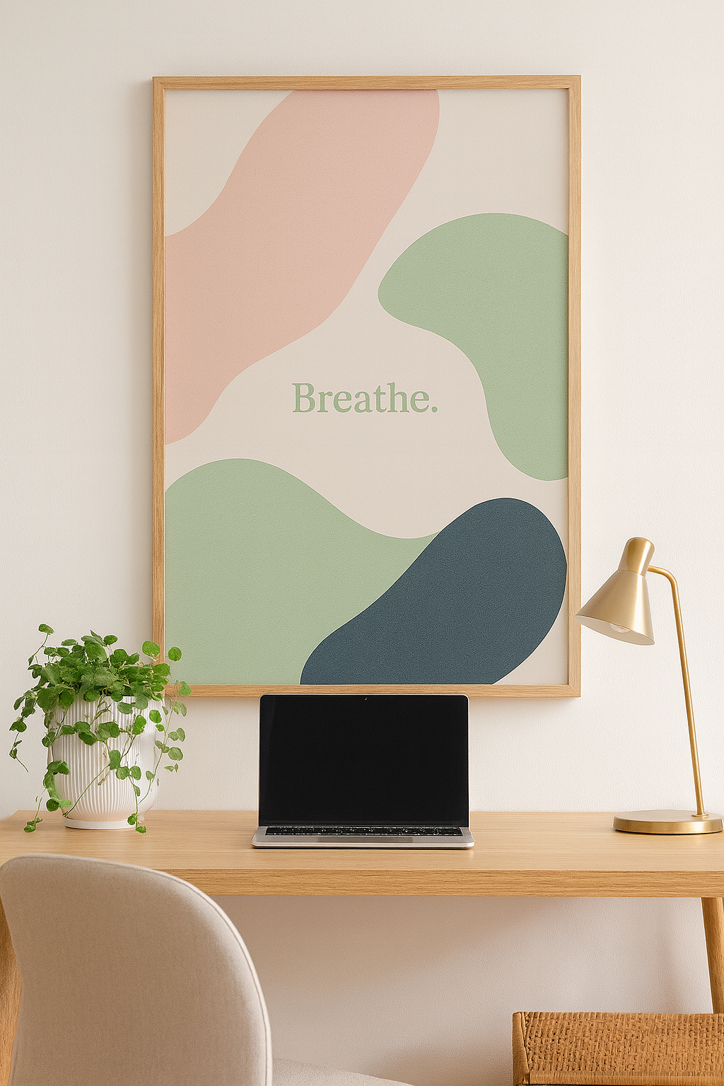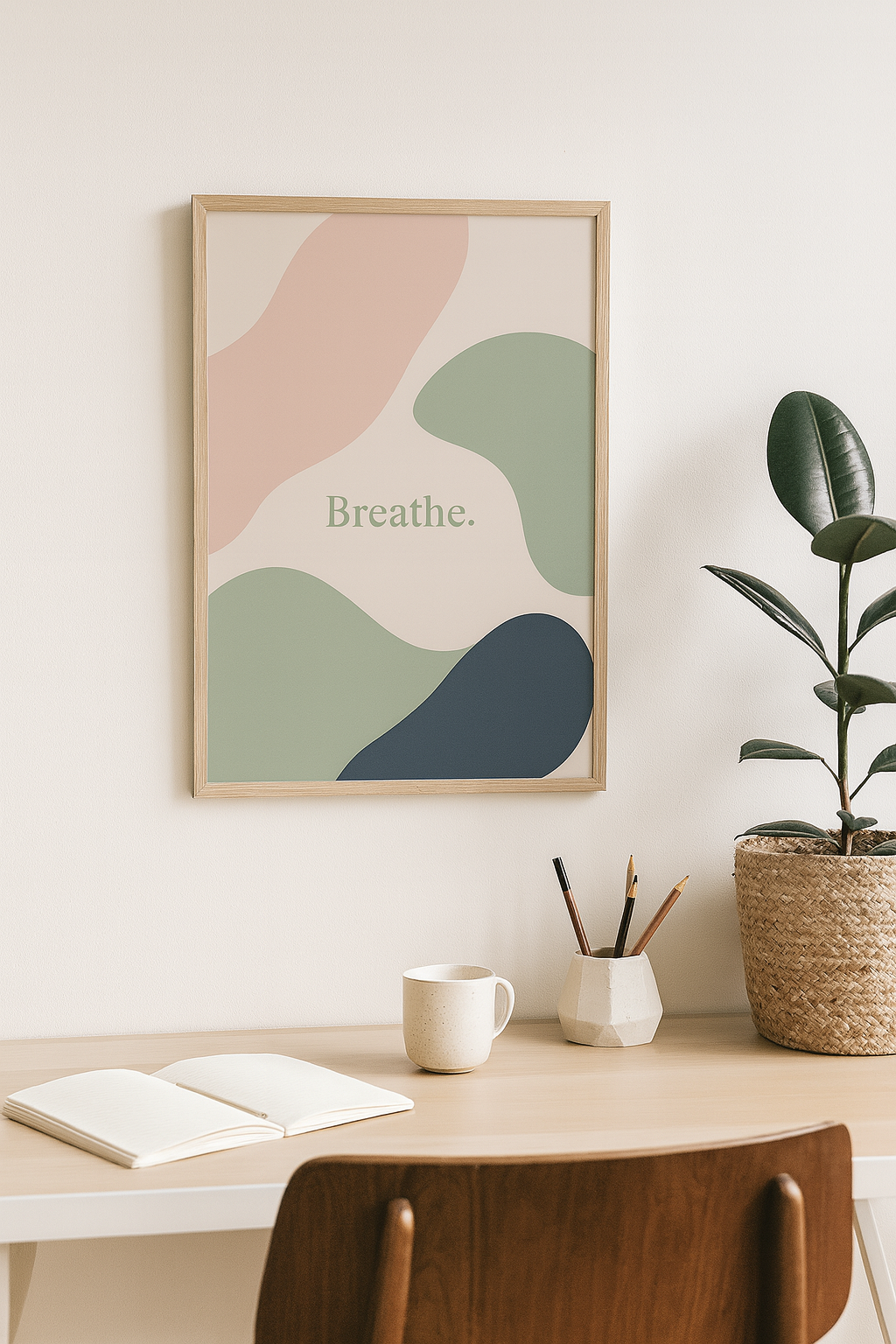 Bring a sense of peace and balance into your space with this Breathe digital poster. Featuring soft, organic shapes in muted pastel tones, this minimalist design creates a calming atmosphere — perfect for bedrooms, meditation corners, or cozy living spaces. A gentle reminder to slow down and take a deep breath every day.