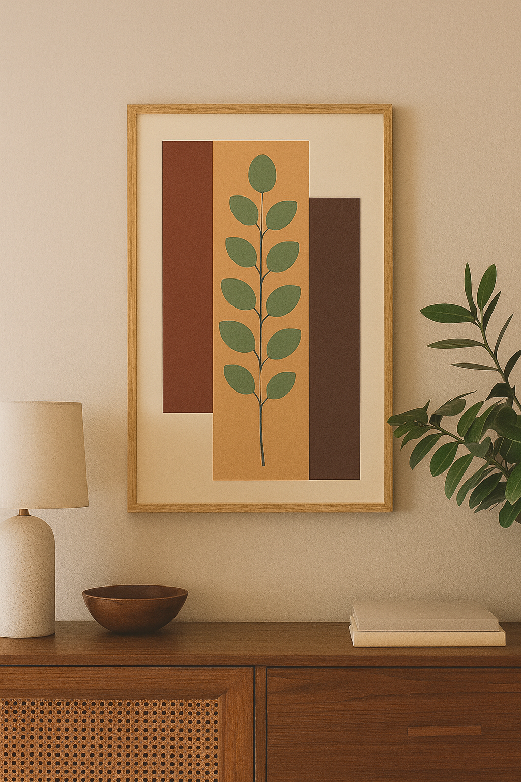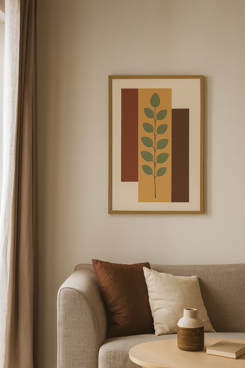 A striking mid-century inspired print featuring a stylized leaf branch placed over bold geometric blocks in golden ochre, terracotta red, and deep brown. The rich earthy tones and clean botanical form create a perfect balance of warmth and modernity. Ideal for adding cozy sophistication to kitchens, dining rooms, living spaces, or Scandinavian and Bauhaus-inspired interiors.
