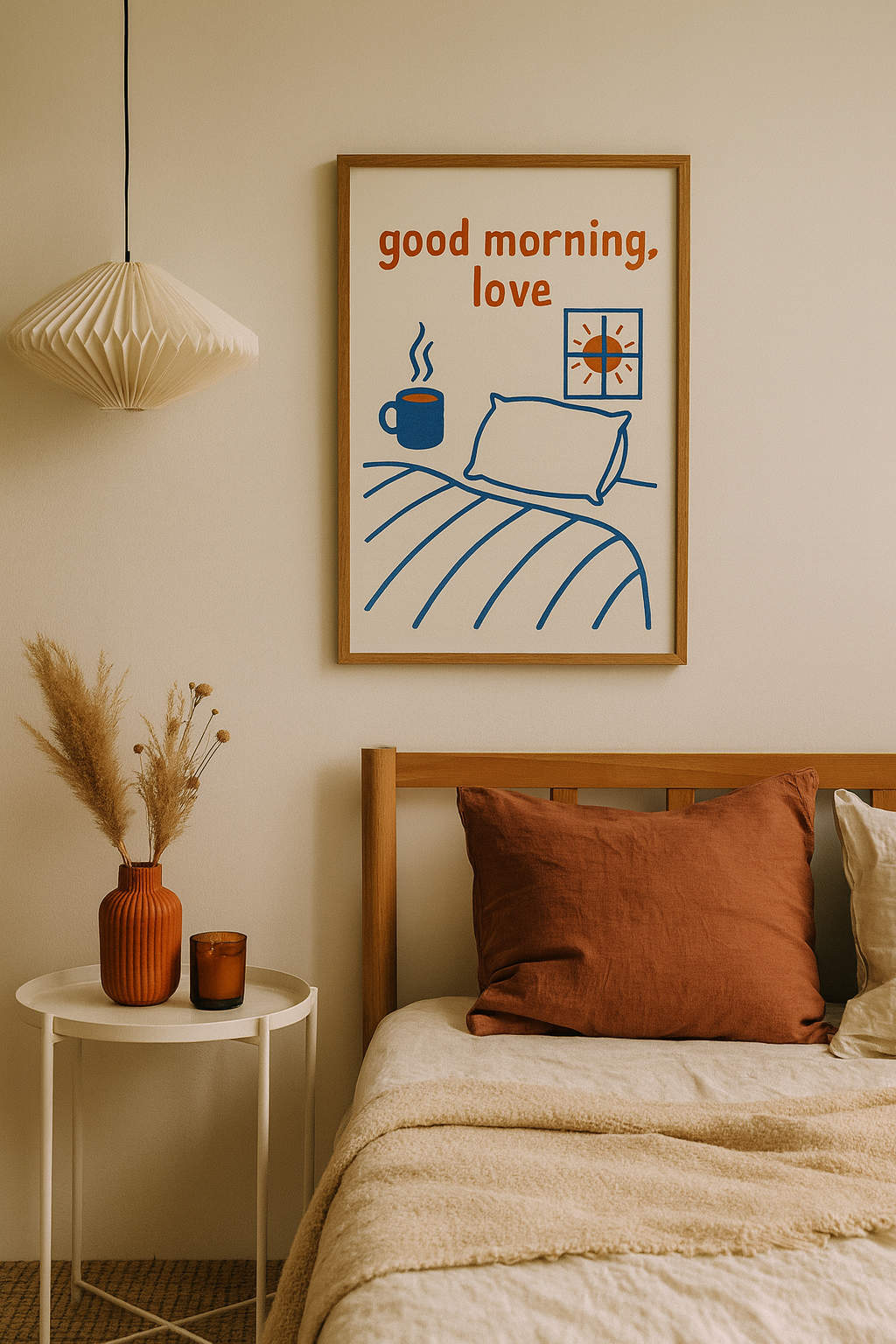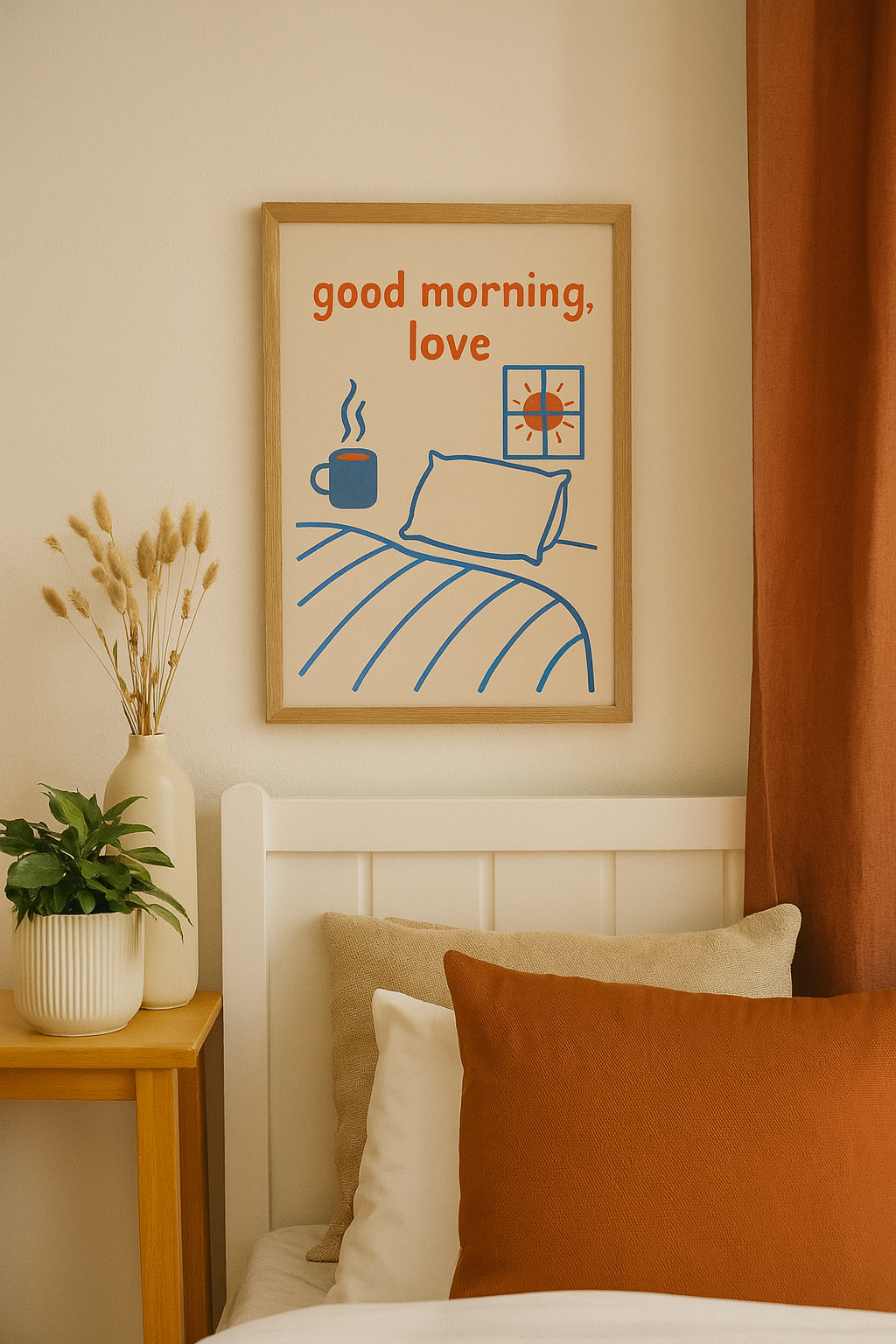 Start every morning with a warm smile and a reminder of love with this “Good Morning, Love” digital poster. With its cozy minimalist design, playful orange accents, and calming blue tones, this artwork is perfect for bringing a soft, romantic vibe to your bedroom. Whether paired with your morning coffee or simply as a sweet touch above your nightstand, it creates a space that feels warm, inviting, and full of affection.