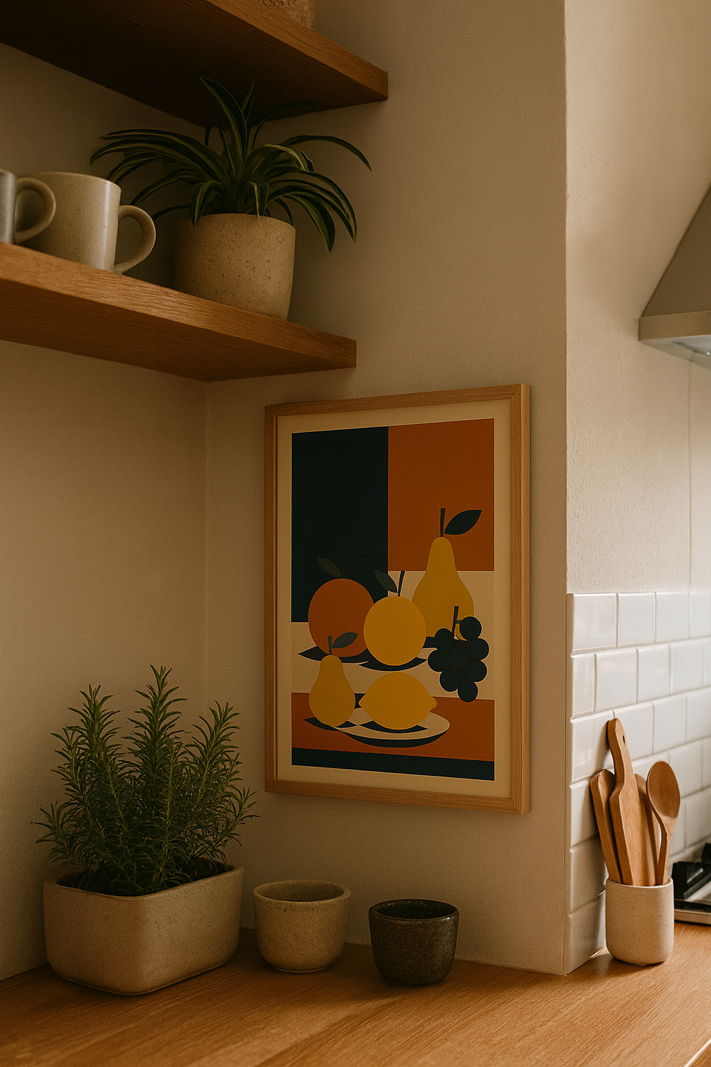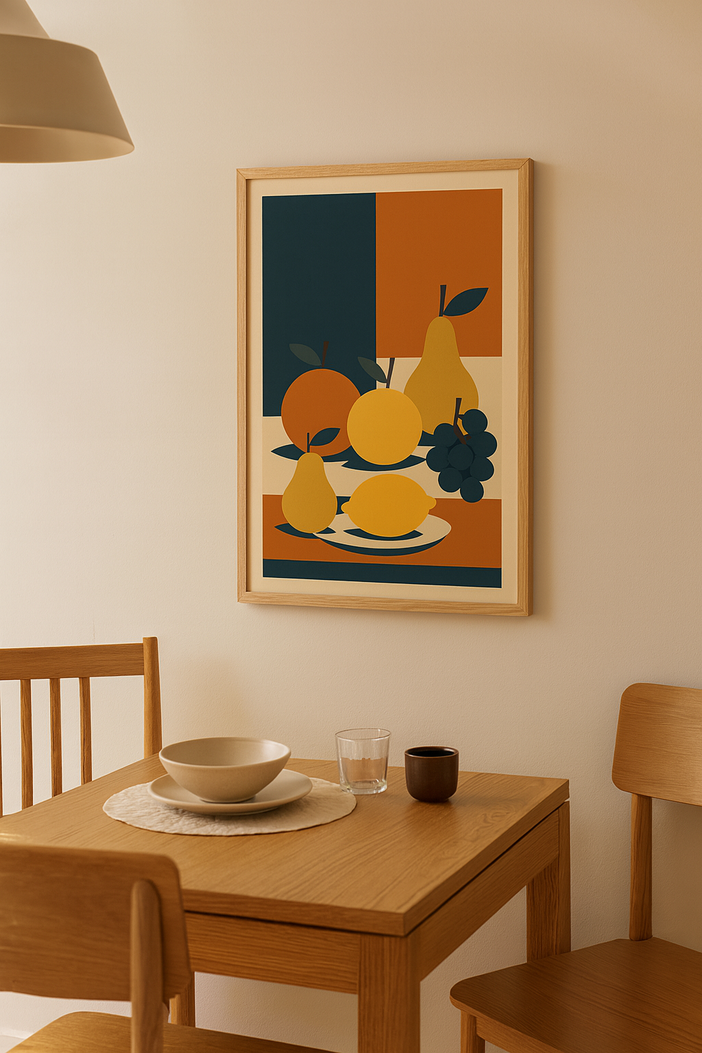 A bold, minimalist fruit-inspired poster featuring pears, grapes, lemon, and citrus in geometric Bauhaus style. The deep navy, terracotta, and golden yellow palette creates a timeless warmth—perfect for brightening your kitchen or dining space. This artwork isn’t just decoration; it brings a fresh, modern rhythm to your everyday meals.