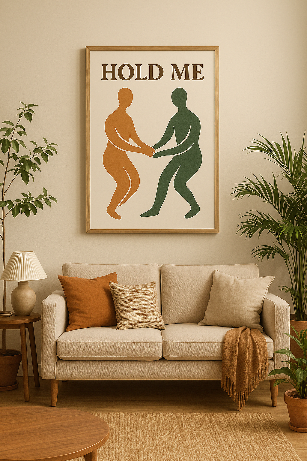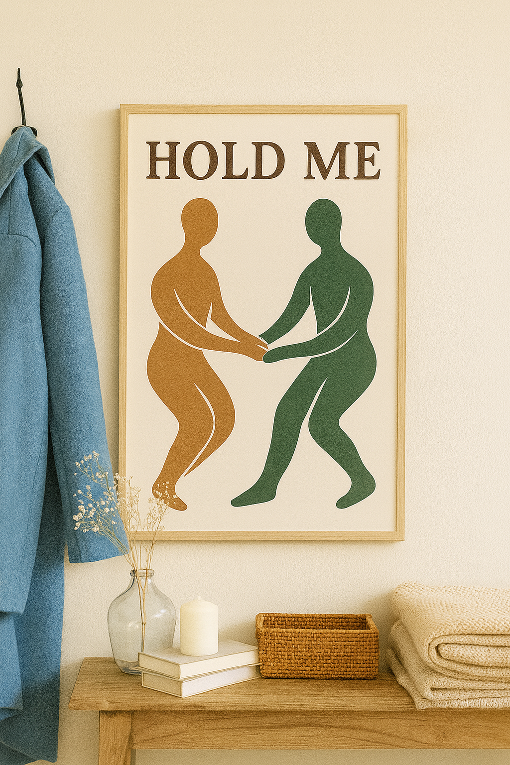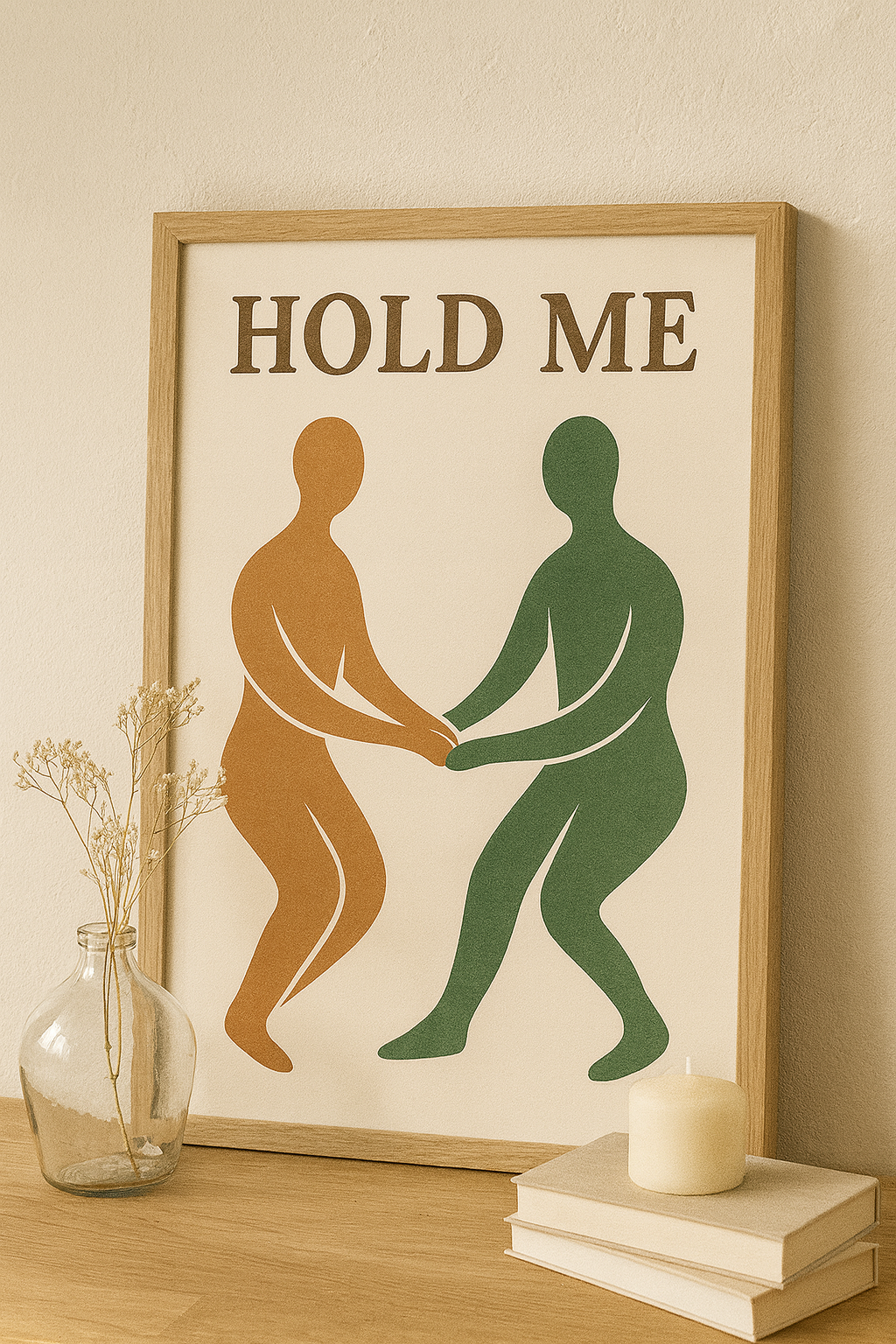 Celebrate the beauty of connection with this Hold Me abstract digital poster. Featuring two minimalist silhouettes in earthy green and warm brown tones, this artwork brings a sense of intimacy, balance, and harmony. Perfect for living rooms, entryways, or modern minimalist interiors — it creates a welcoming and stylish atmosphere.