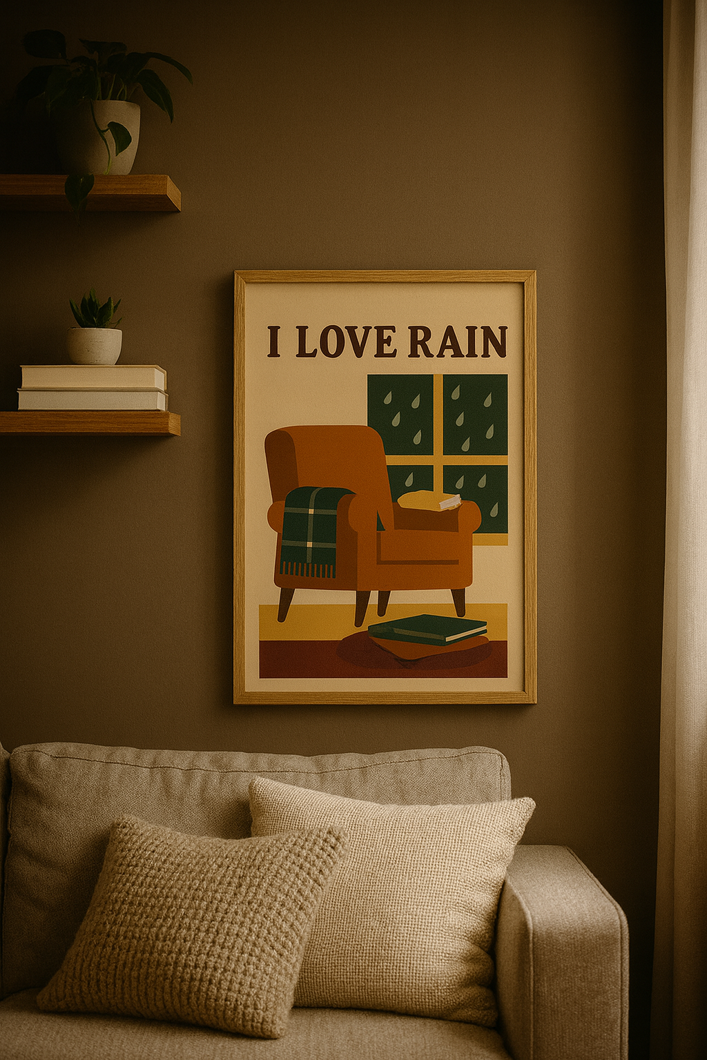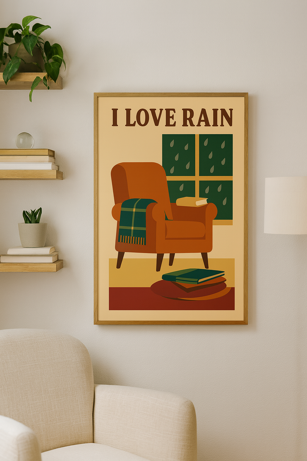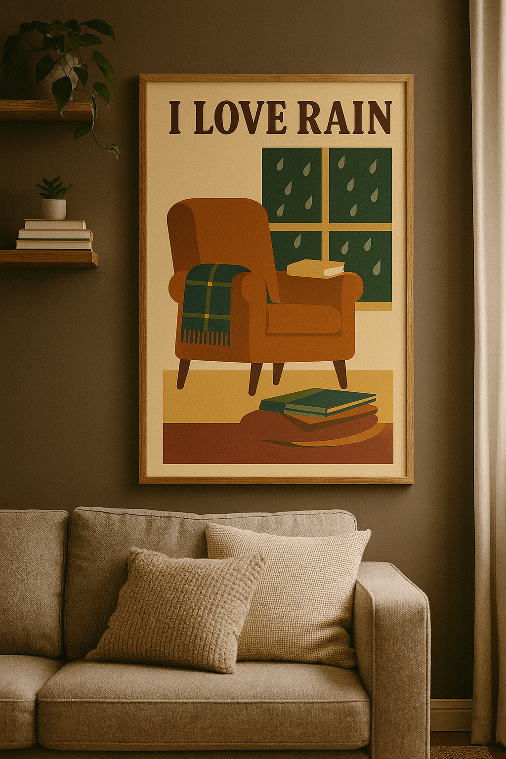 A cozy mid-century modern poster capturing the calm beauty of a rainy day: a warm armchair with a plaid throw, books stacked nearby, and raindrops sliding down the window. Earthy tones of terracotta, olive green, and golden beige create a soothing, nostalgic atmosphere — perfect for slow mornings and peaceful evenings.