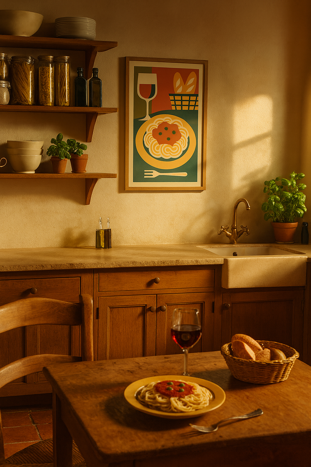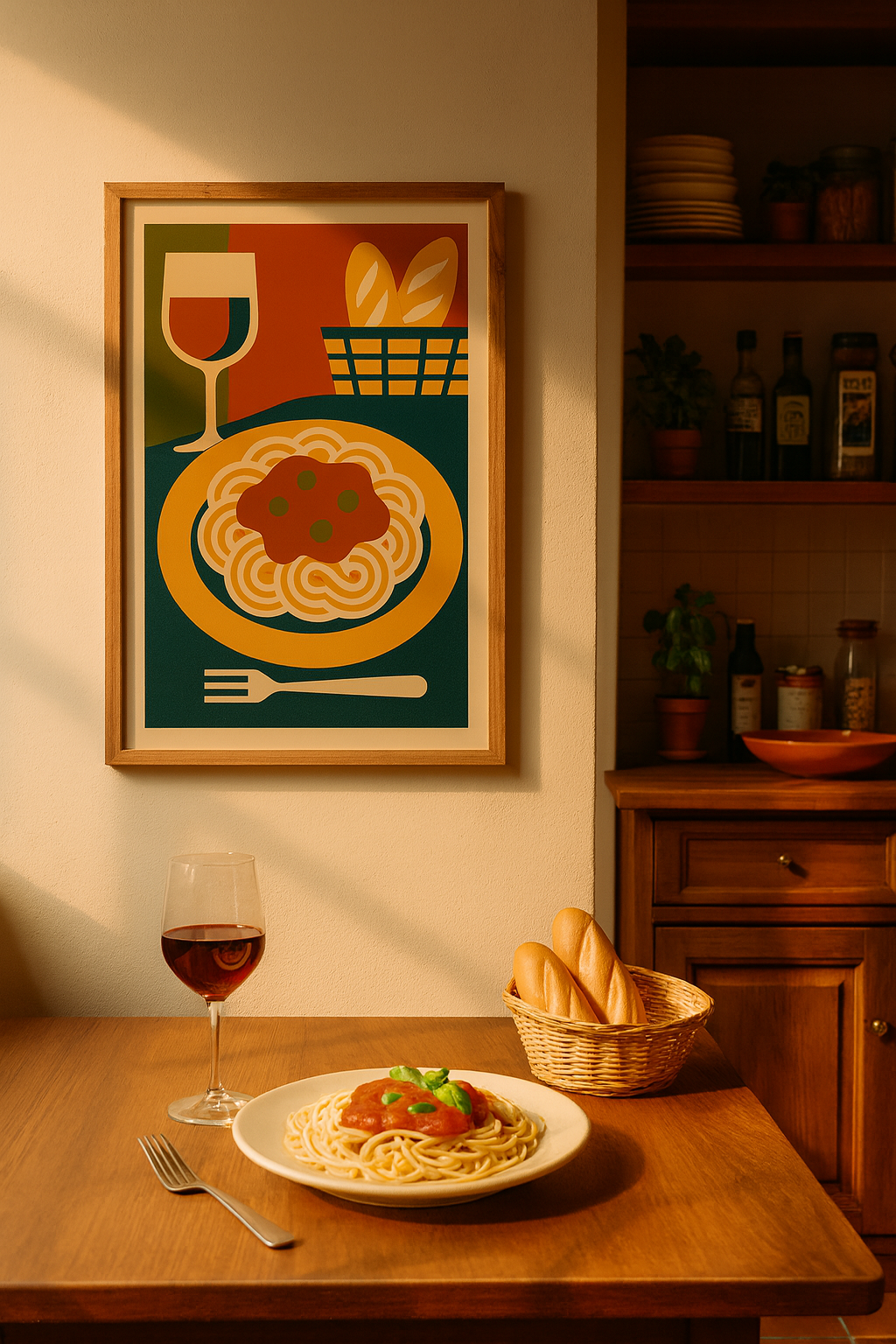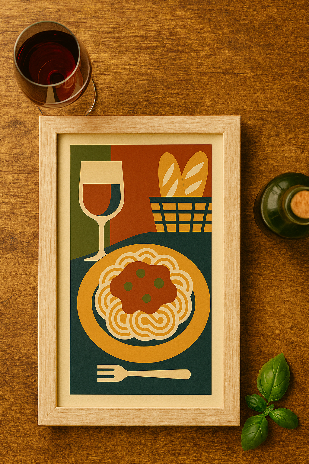 A warm Bauhaus-inspired poster featuring a plate of pasta with tomato sauce, a glass of red wine, and fresh bread. The earthy terracotta, golden yellow, and deep green palette evokes the charm of an Italian supper—perfect for dining rooms, kitchens, or cozy cafés. This artwork doesn’t just decorate; it creates an atmosphere of shared meals and timeless Mediterranean joy.