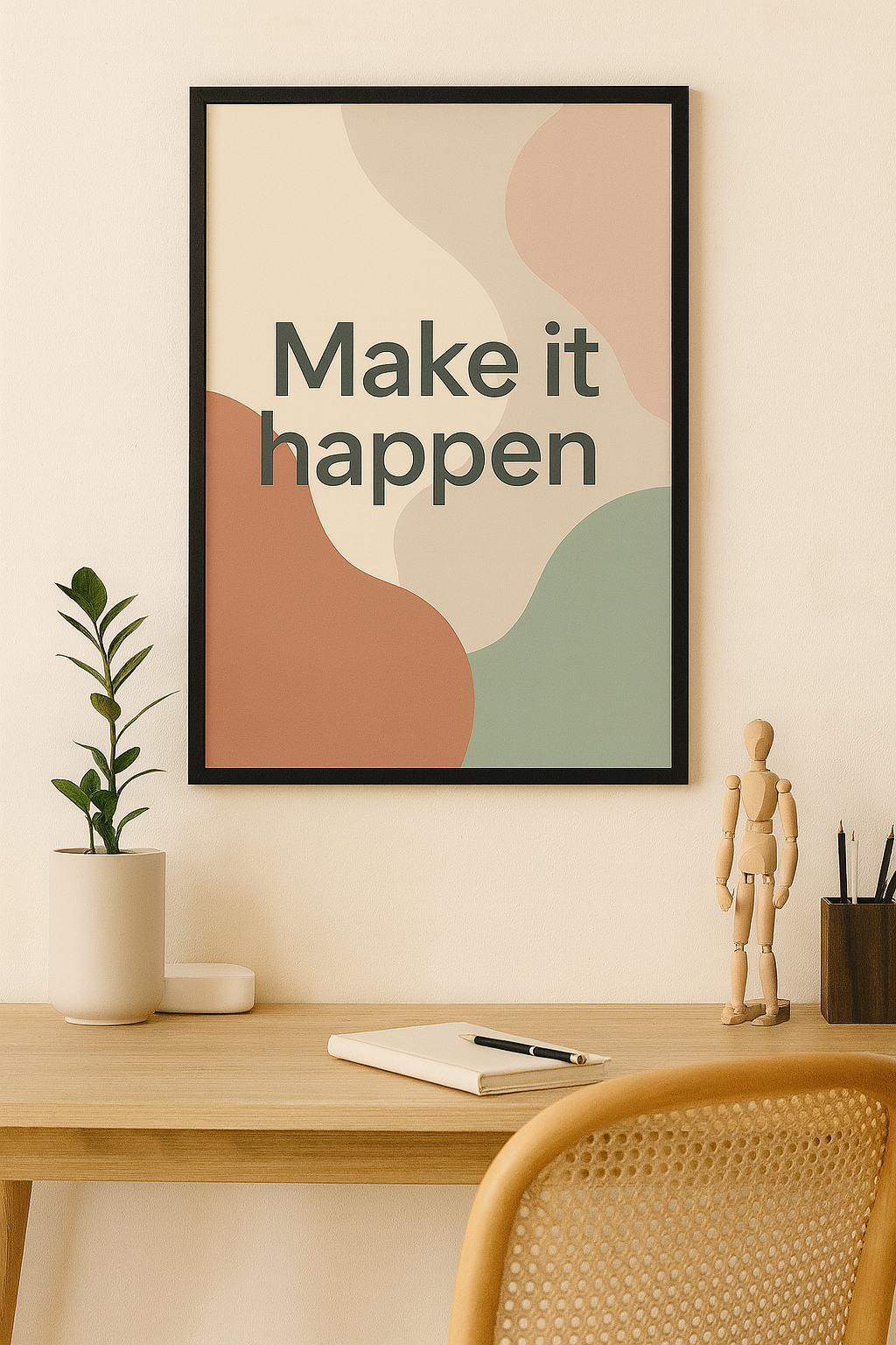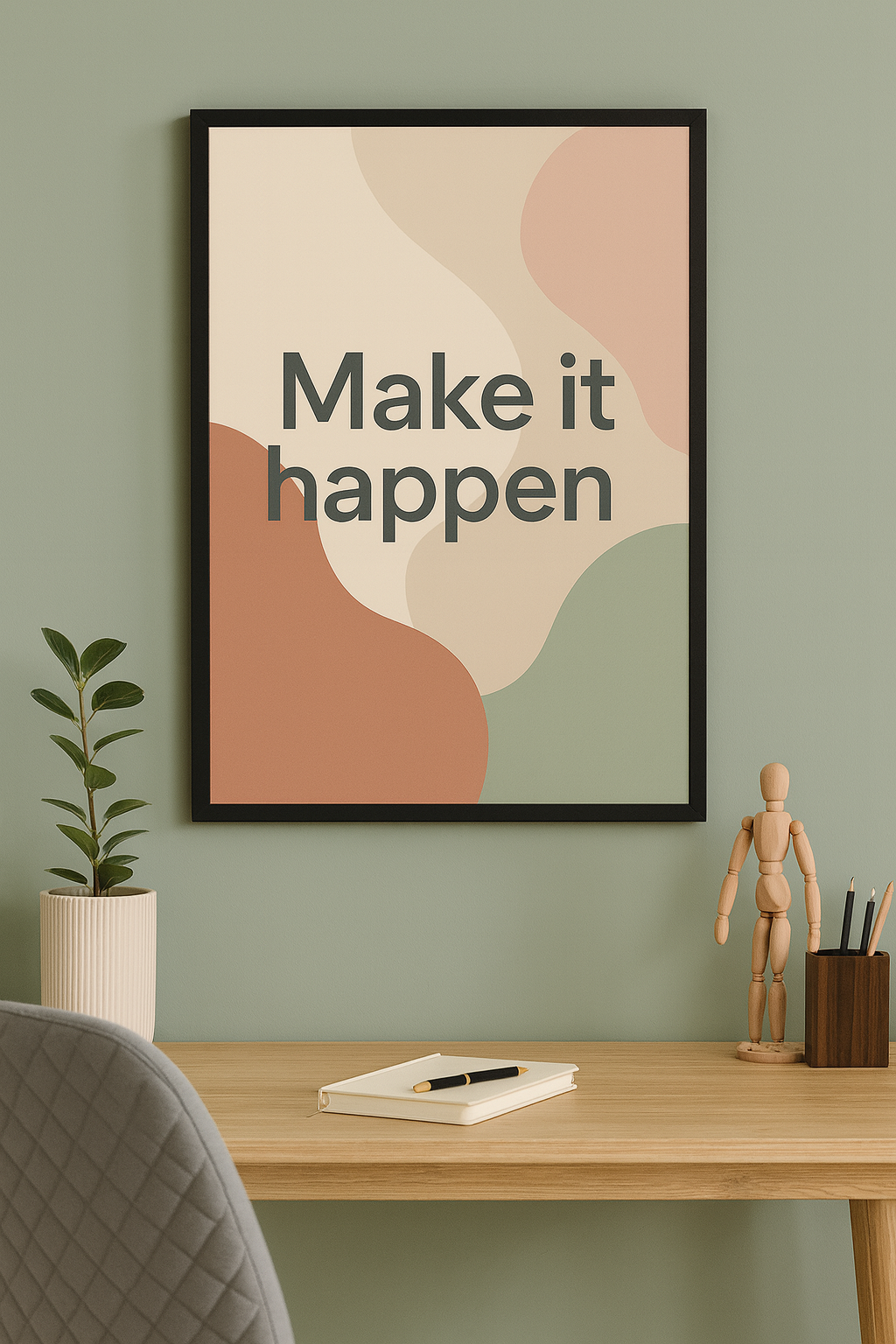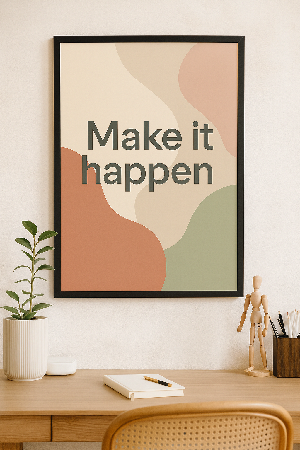 Transform your walls into a source of daily inspiration with this MAKE IT HAPPEN digital art print. The soft earthy tones and minimalist abstract shapes bring a calm yet empowering atmosphere, while the bold typography keeps you focused on action. Perfect for your office, living room, or creative space — a reminder that dreams only work if you do.
