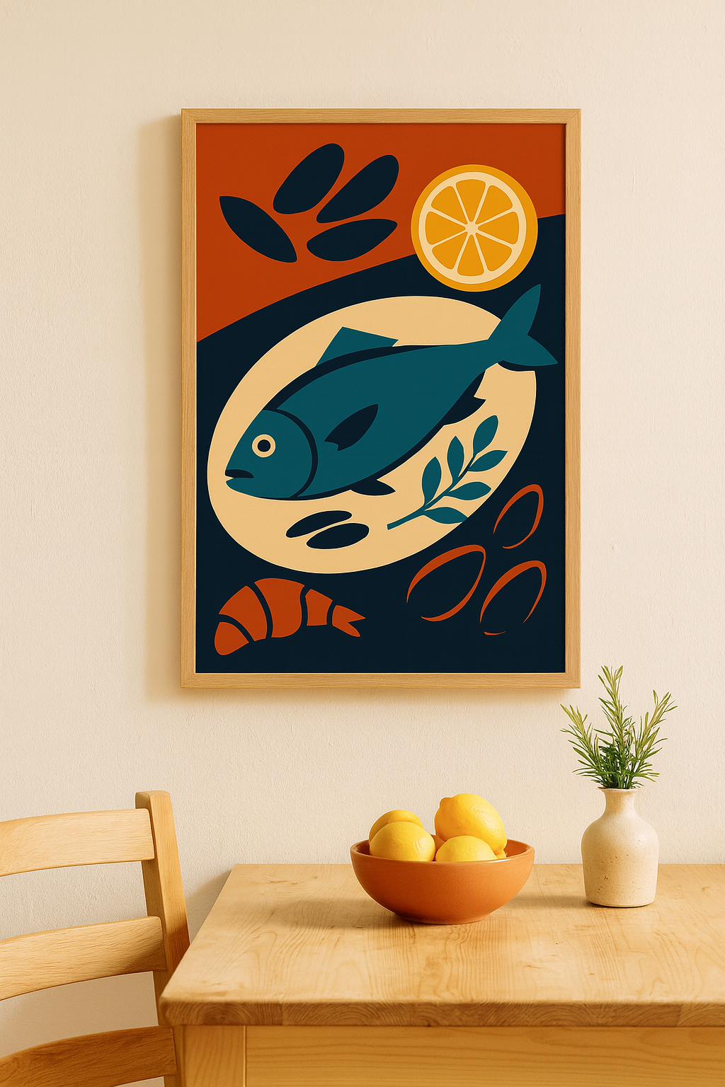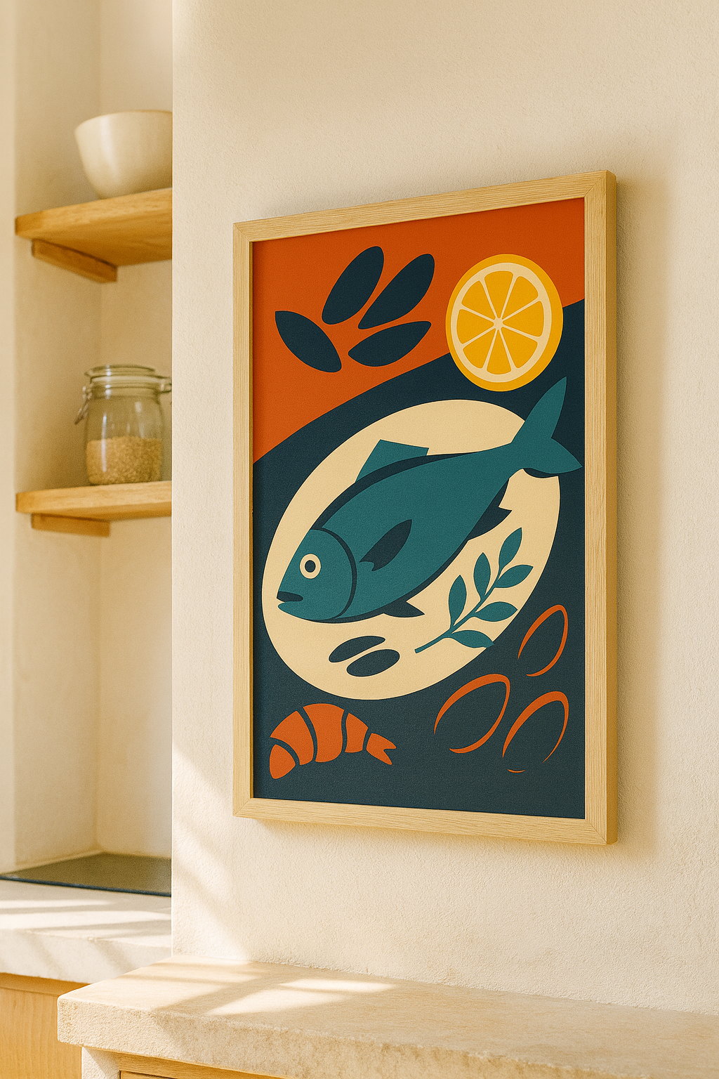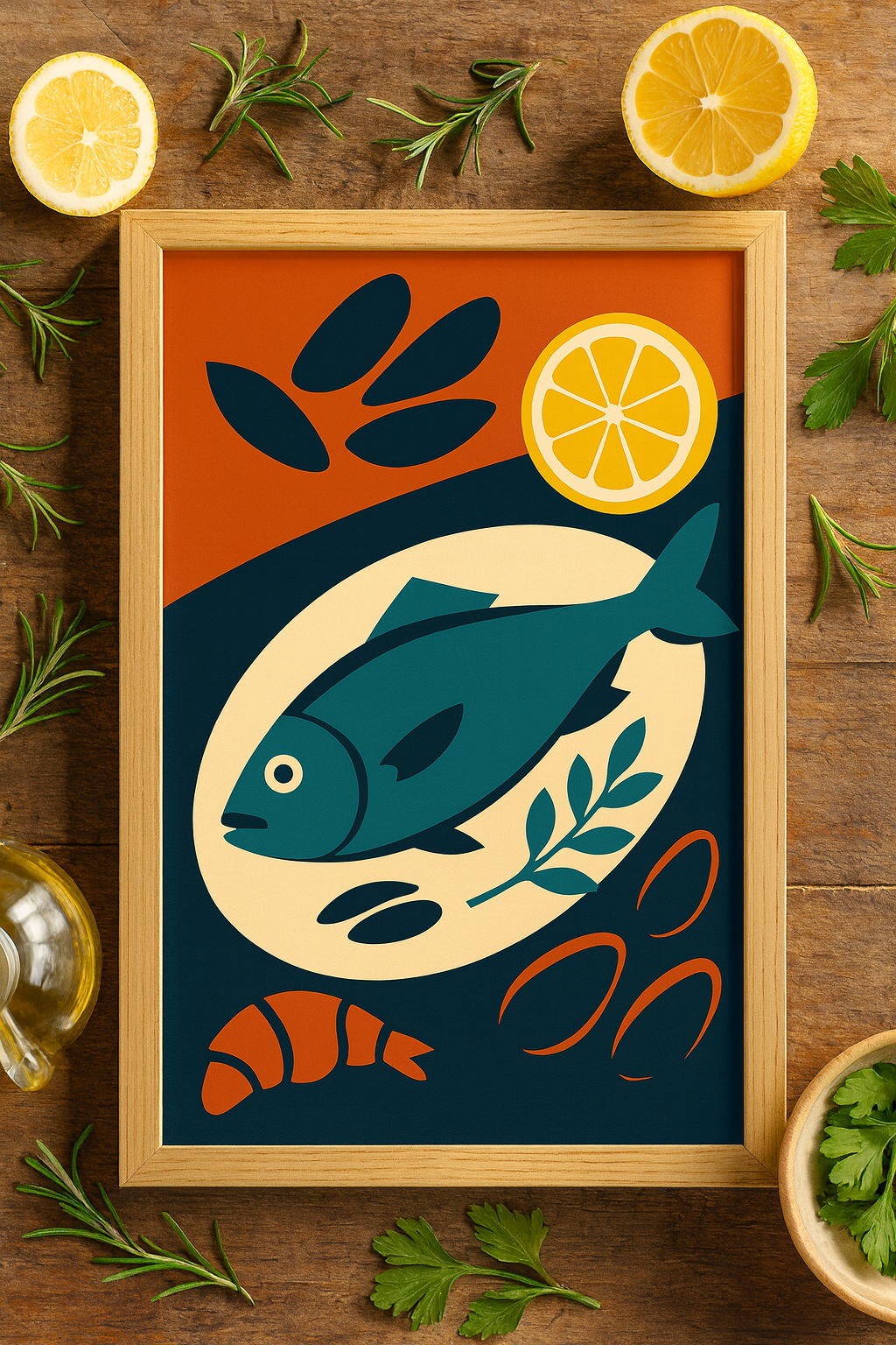 A bold Bauhaus-inspired poster featuring a fish, lemon, and herbs in a geometric still life. The deep navy, terracotta, and golden yellow tones capture the warmth of the Mediterranean table—perfect for kitchens, dining rooms, or restaurants. This artwork brings freshness, elegance, and a modern coastal vibe to your home.