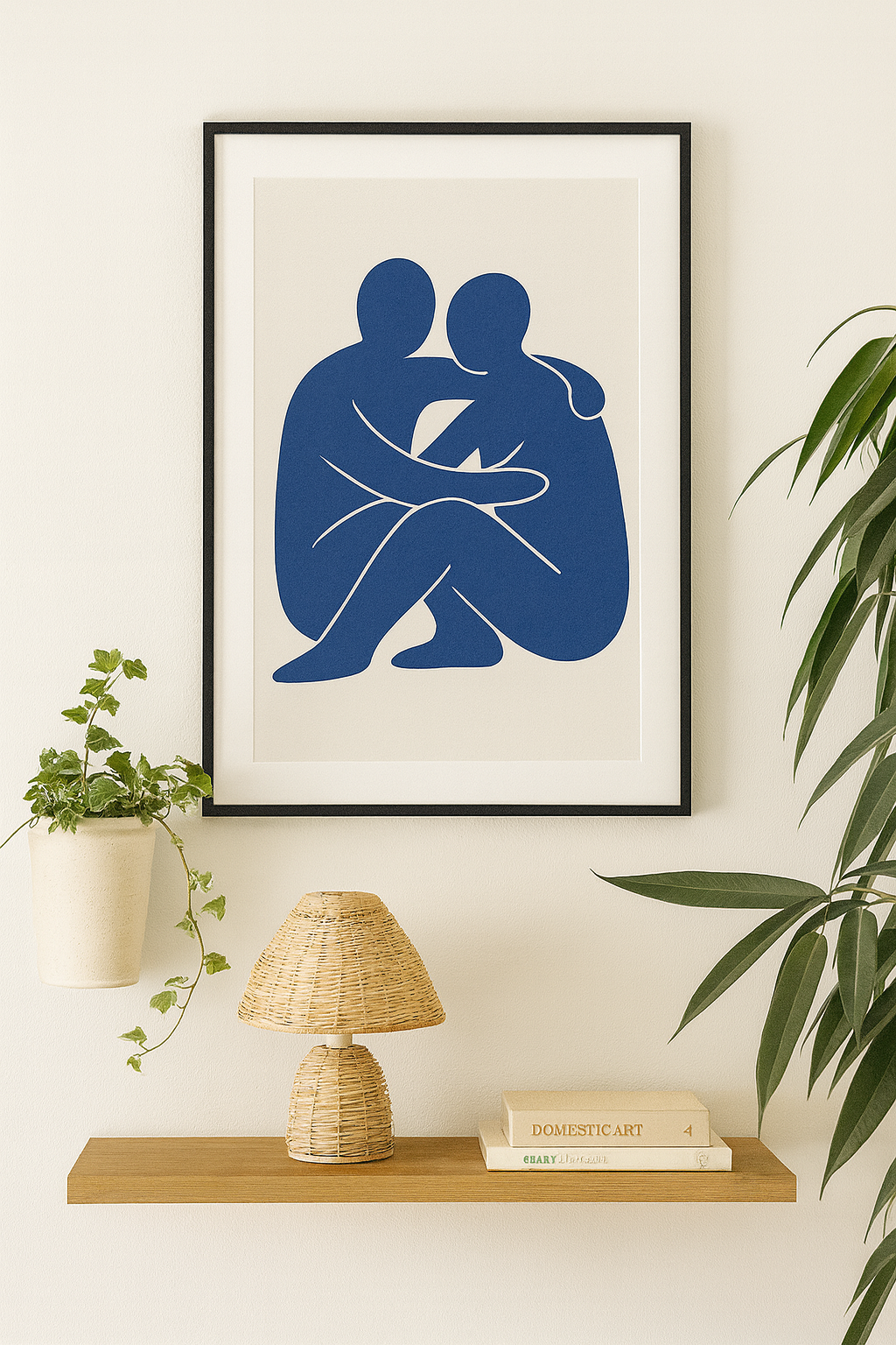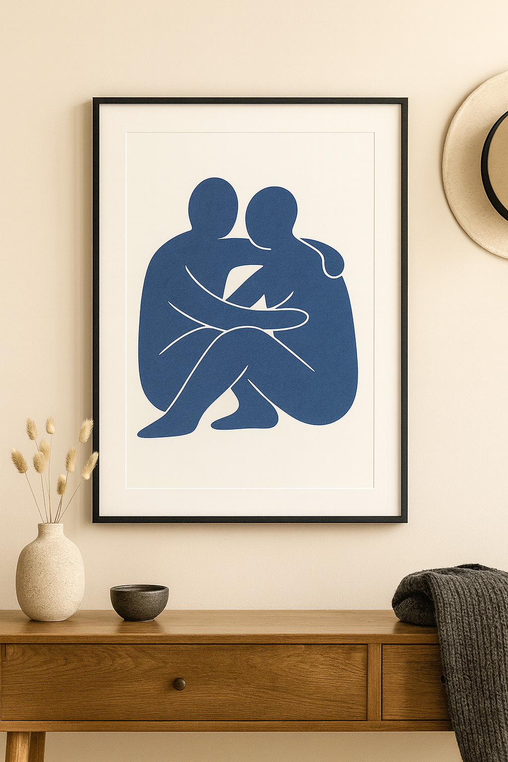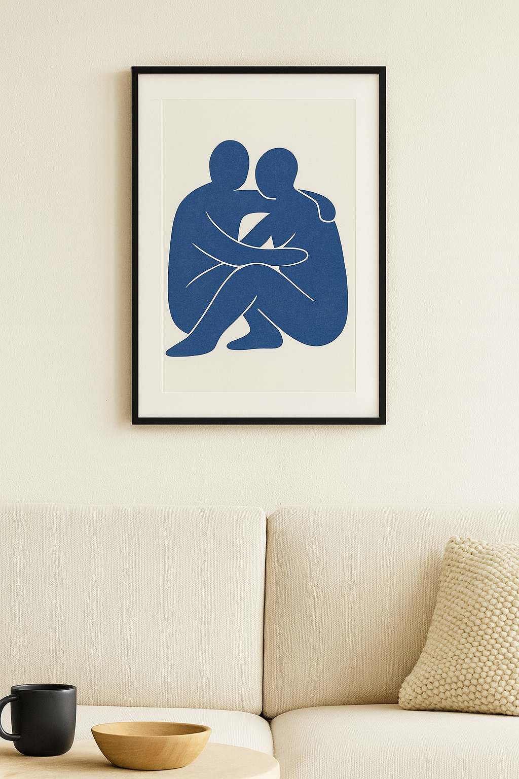 Add quiet emotion and sophistication to your space with this abstract minimalist poster of two figures in a soft embrace. The deep blue silhouette on a textured neutral background creates a sense of balance, love, and calm — perfect for modern, Scandinavian, or Japandi interiors.