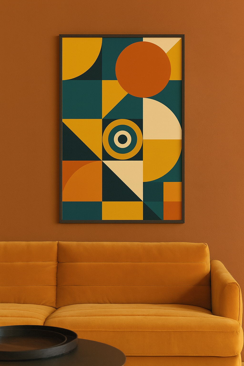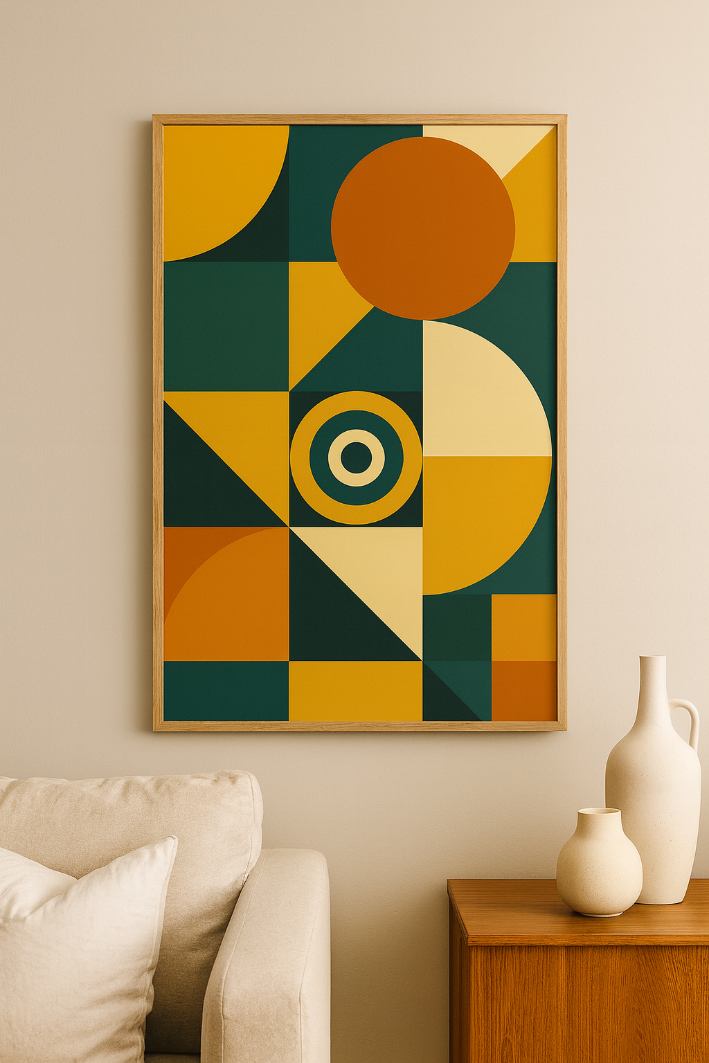 A bold mid-century modern inspired poster featuring clean geometric shapes in warm mustard, terracotta, deep teal, and soft beige. The perfectly balanced composition of circles, triangles, and rectangles creates a striking visual harmony, bringing both energy and sophistication to your space. With a subtle paper texture effect, this piece captures the timeless essence of Bauhaus and modernist design.