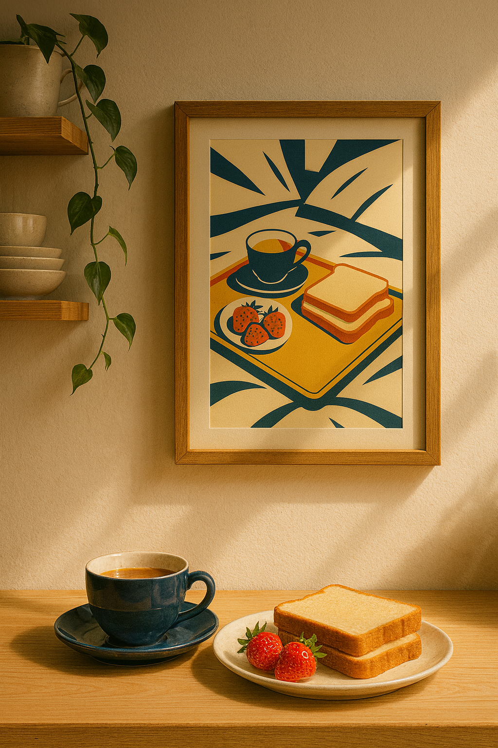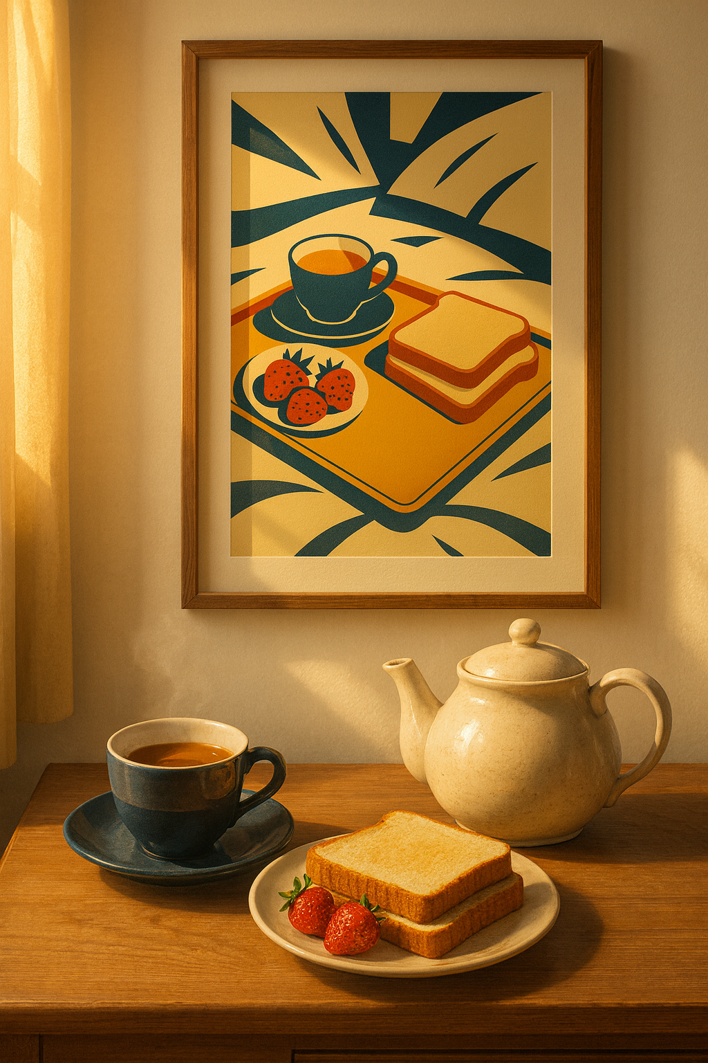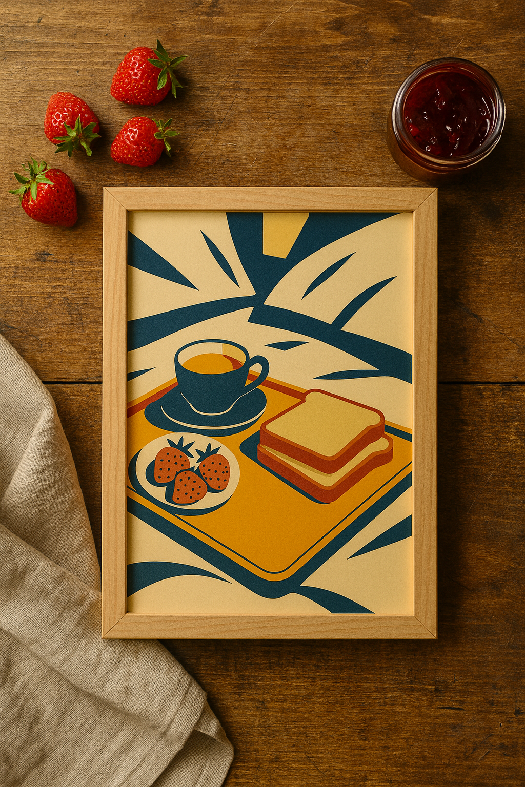A cozy Bauhaus-inspired poster featuring a warm morning tray: a cup of tea, fresh strawberries, and toasted bread, all nestled against soft bedding folds. The deep navy, golden ochre, and warm red palette captures the comfort of slow mornings and the charm of simple pleasures. Perfect for kitchens, bedrooms, or stylish cafés that celebrate mindful living.