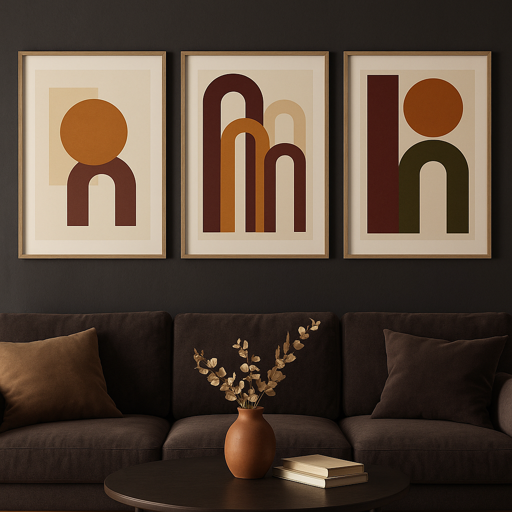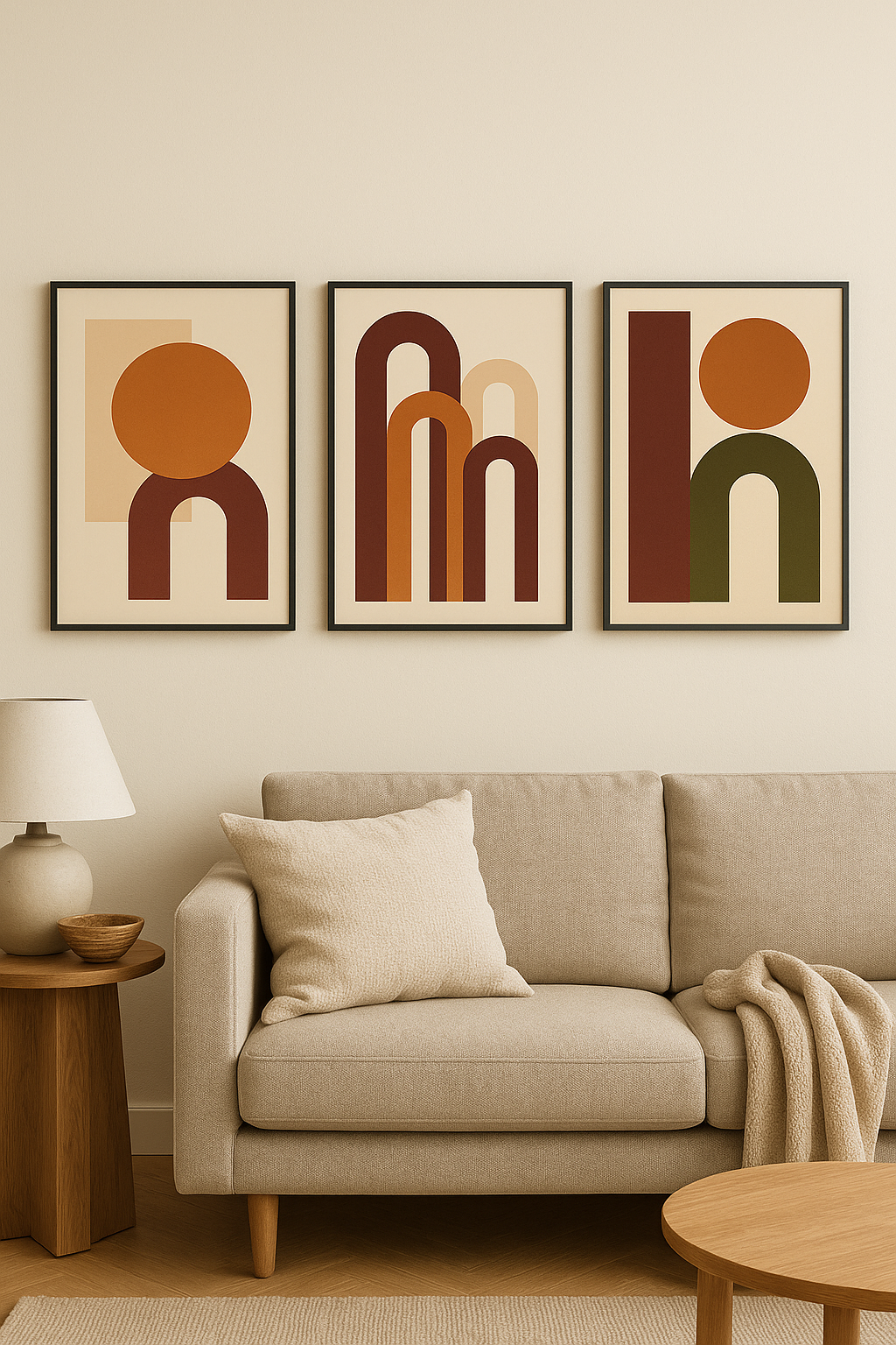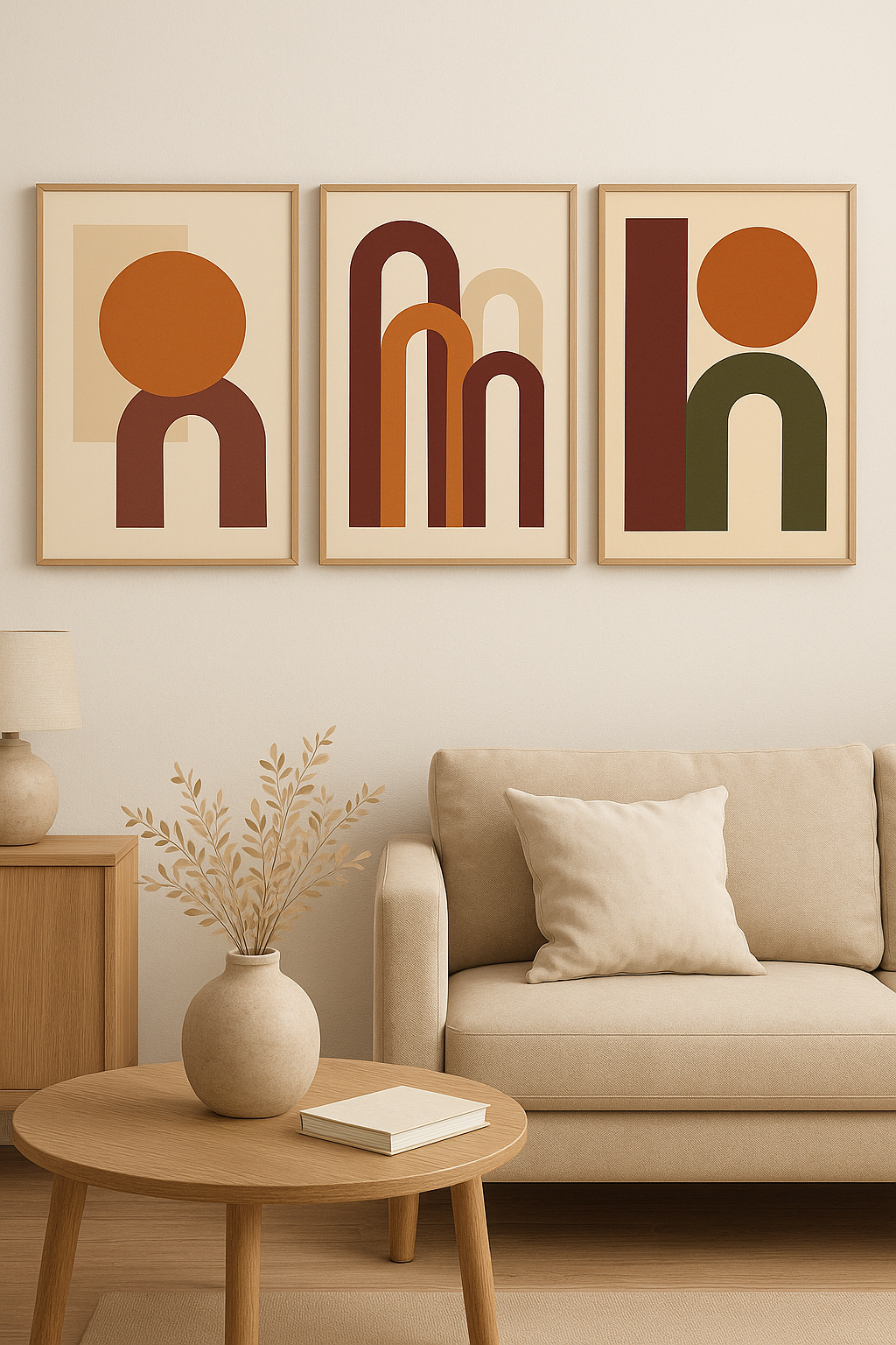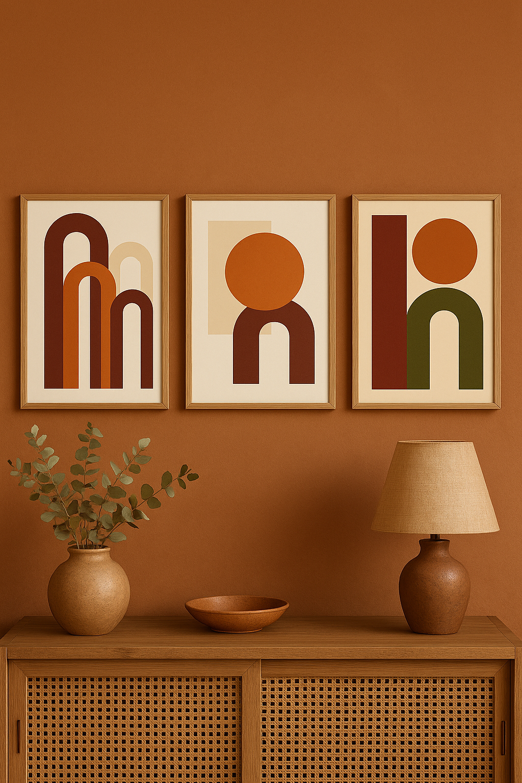 A bold and elegant digital poster triptych inspired by Bauhaus principles and mid-century warmth. With rich earthy tones—terracotta, deep burgundy, mustard, and olive—these geometric printable artworks bring structure and calm to any interior. The soft shapes and rhythmic arches create a soothing visual harmony for modern, boho, or minimalist spaces.