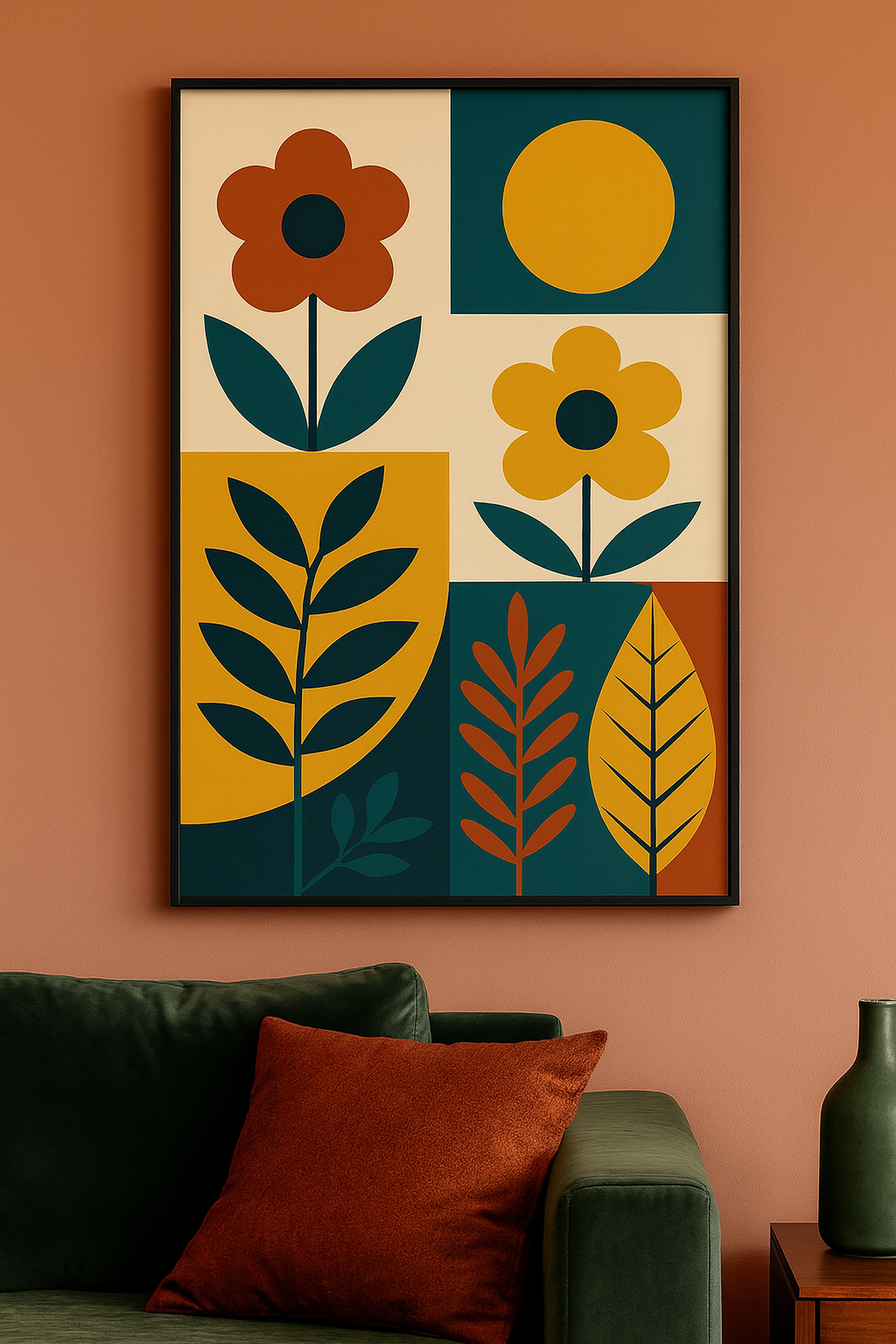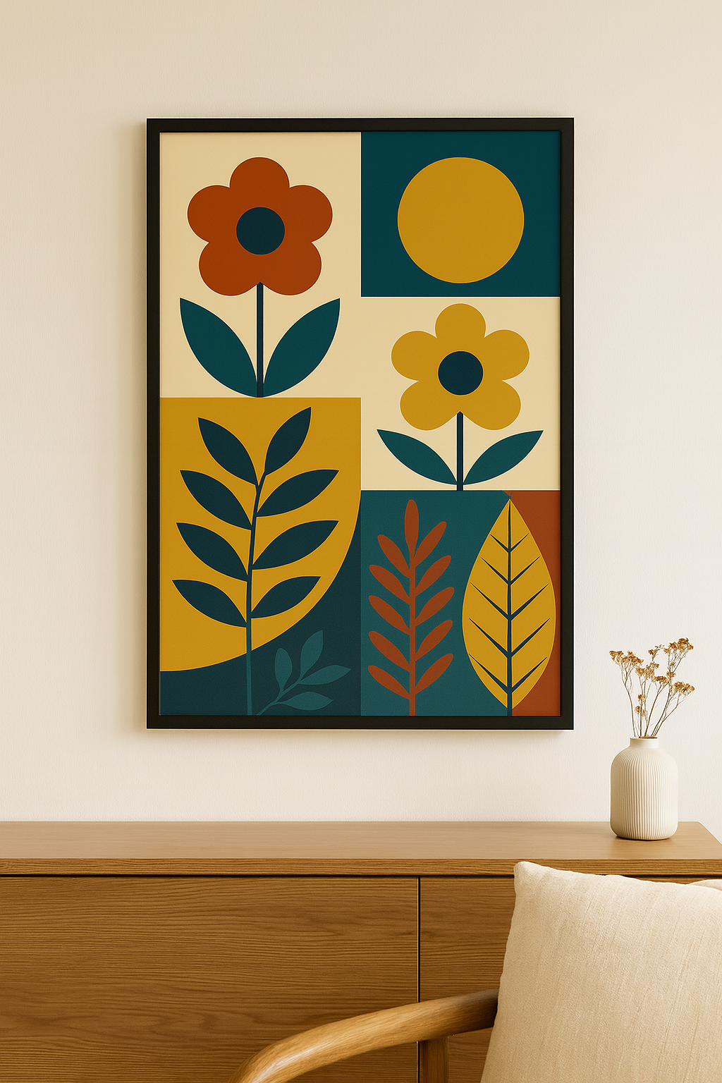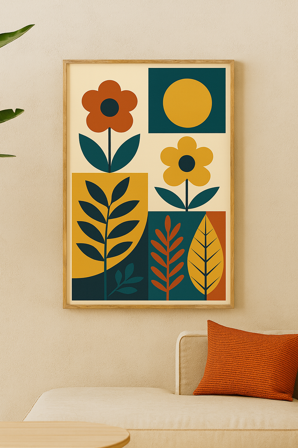 Celebrate the harmony of nature and design with this Bauhaus-inspired botanical poster. Stylized flowers, geometric leaves, and clean lines meet in a palette of warm mustard, terracotta, deep teal, and soft beige, creating a balanced and timeless composition. Perfect for adding a sophisticated yet playful accent to your home, blending modernist precision with organic beauty.