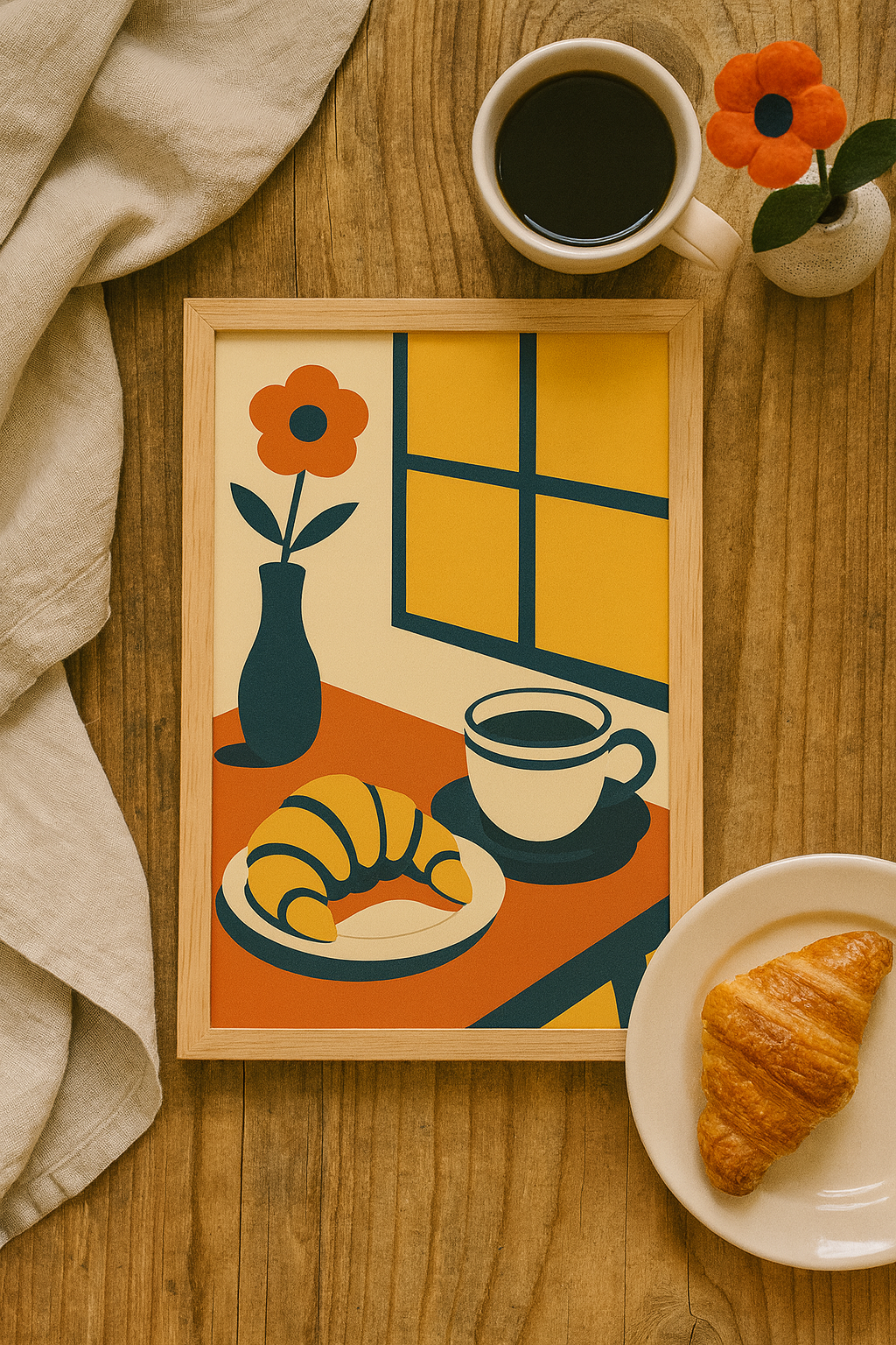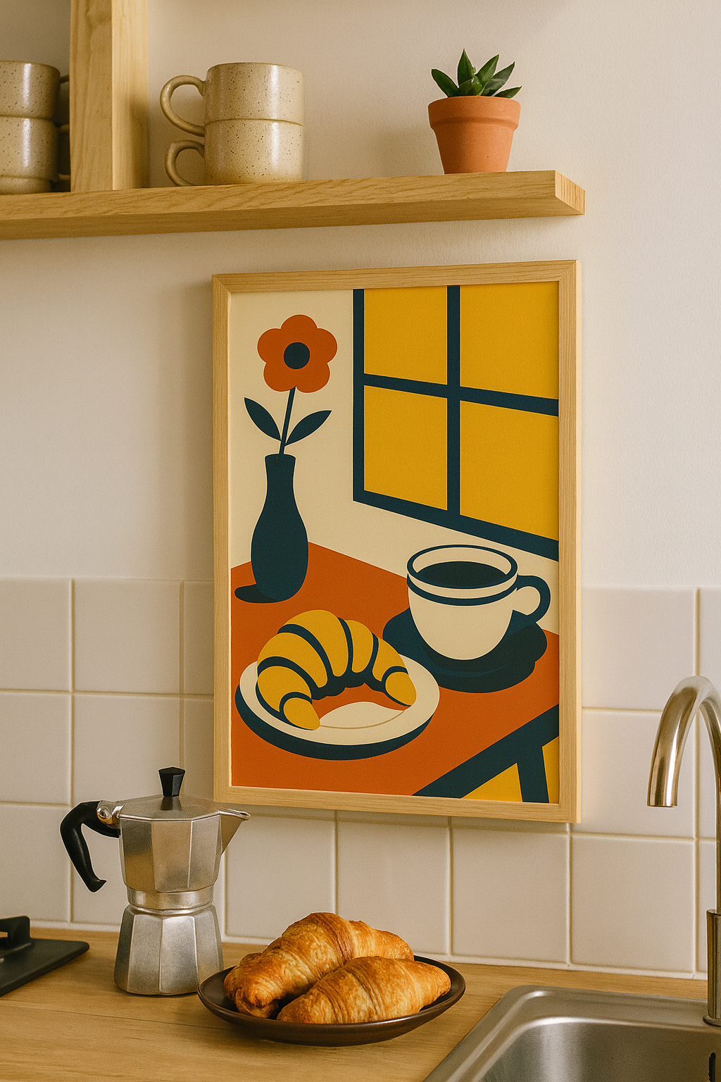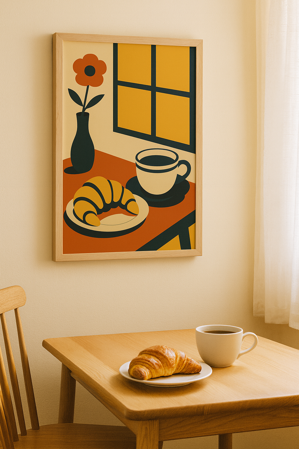 A bright and cozy Bauhaus-inspired poster featuring a croissant, cup of coffee, and a flower vase by the window. The golden yellows, terracotta, and deep navy tones bring warmth and balance—perfect for kitchens, breakfast corners, or cafés. This artwork captures the calm joy of a fresh morning ritual.