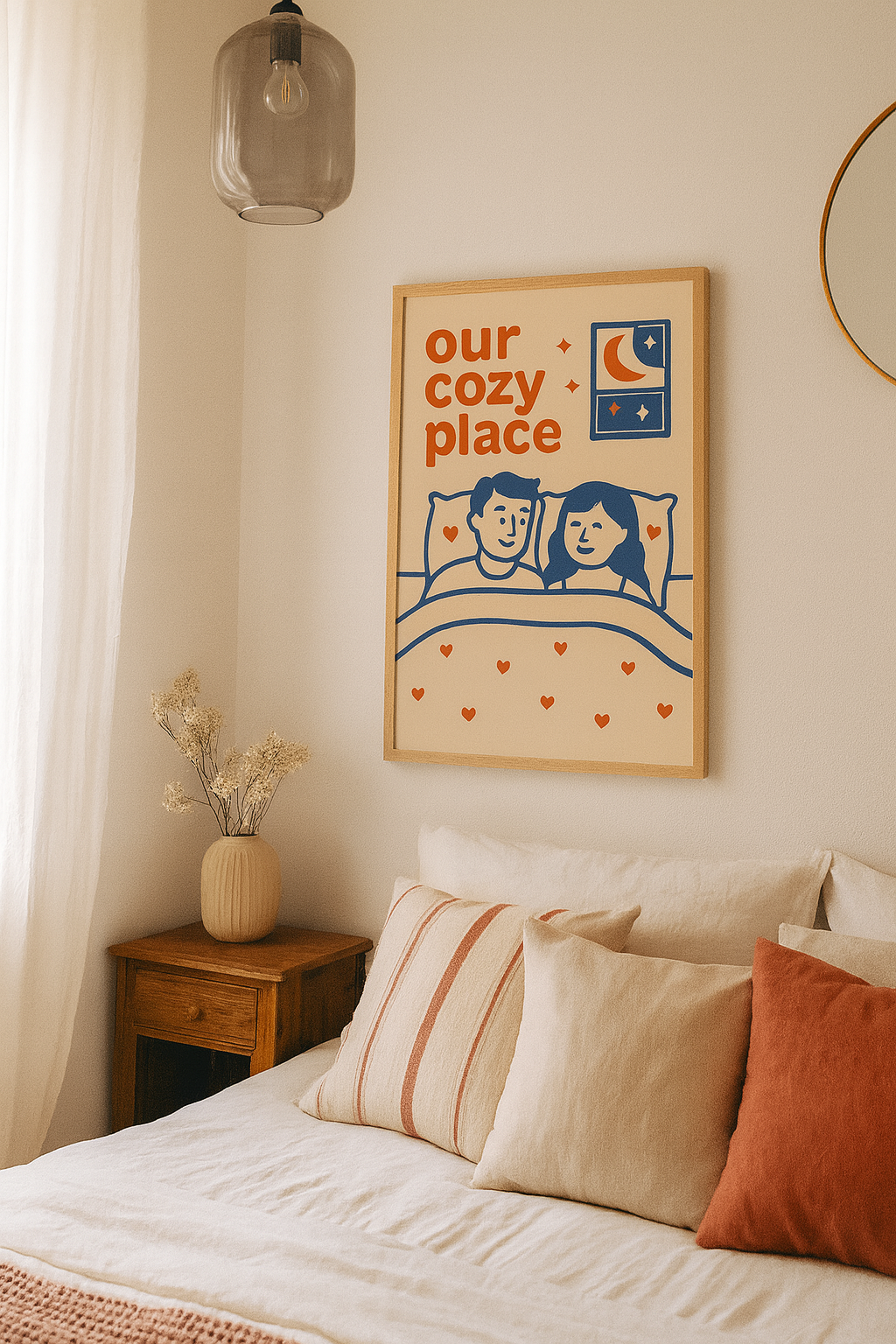 Celebrate love and togetherness with this heartwarming “Our Cozy Place” poster — the perfect addition to a romantic bedroom. Featuring a couple snuggled up under a blanket, surrounded by warm orange hearts and calming blue accents, this print captures the feeling of safety, intimacy, and comfort that only home can bring. Perfect for bedrooms, anniversary gifts, or just to remind yourself how special your shared space is.