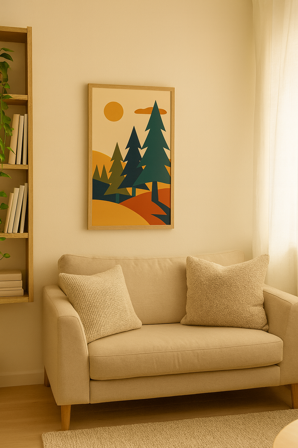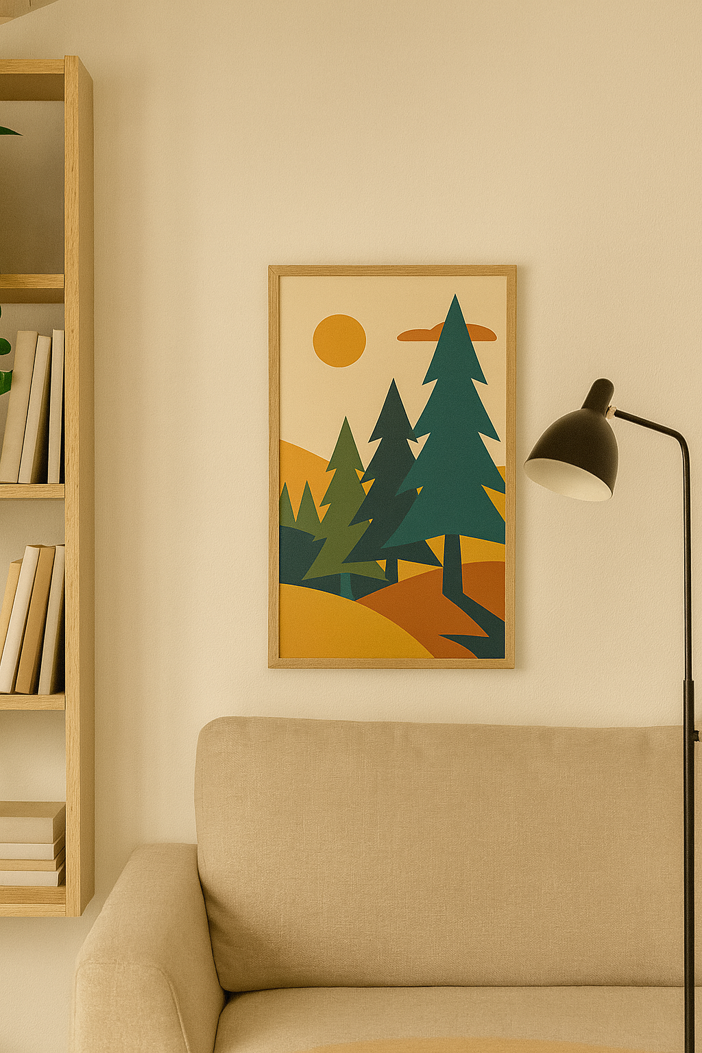 A serene mid-century modern inspired poster featuring abstract pine trees set against rolling golden hills and a soft sunlit sky. Deep green, warm ochre, and earthy terracotta tones create a calming, timeless composition that brings the beauty of nature indoors. Perfect for adding a touch of minimalist sophistication to any room.