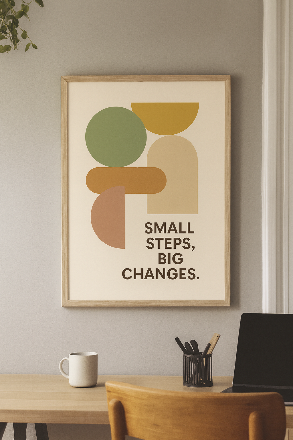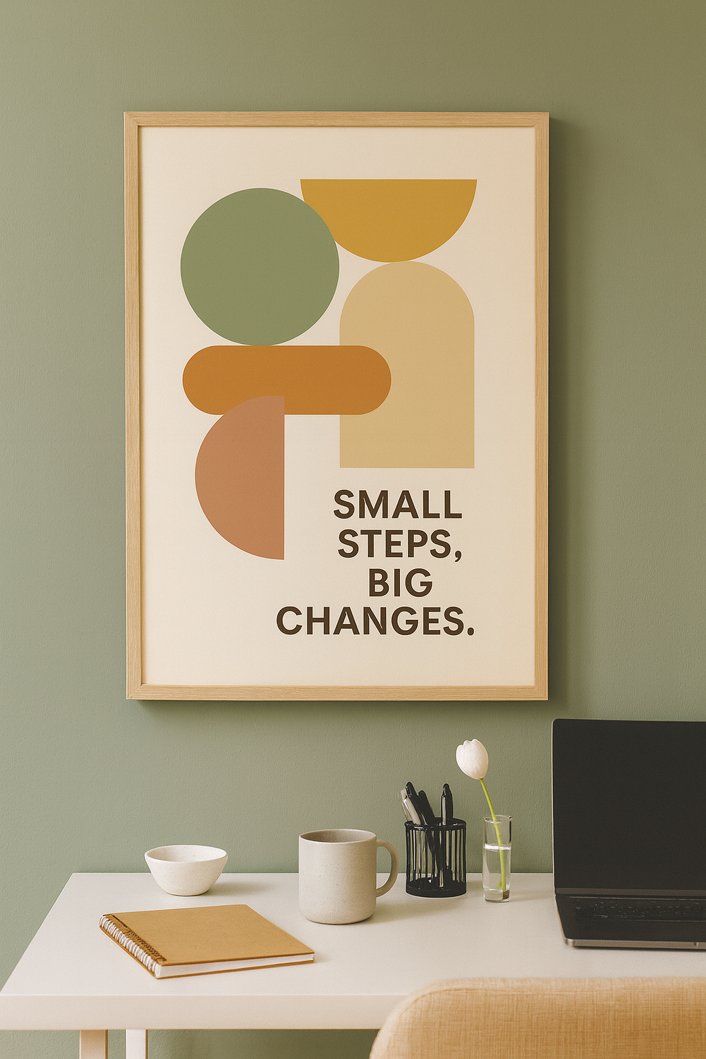 Transform your space and your mindset with this Small Steps, Big Changes digital poster. Featuring clean Bauhaus-inspired shapes in earthy tones of sage green, terracotta, and mustard, this design reminds you that progress is built one step at a time. Ideal for offices, studios, or any room where inspiration matters.