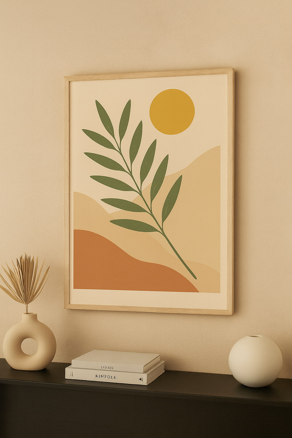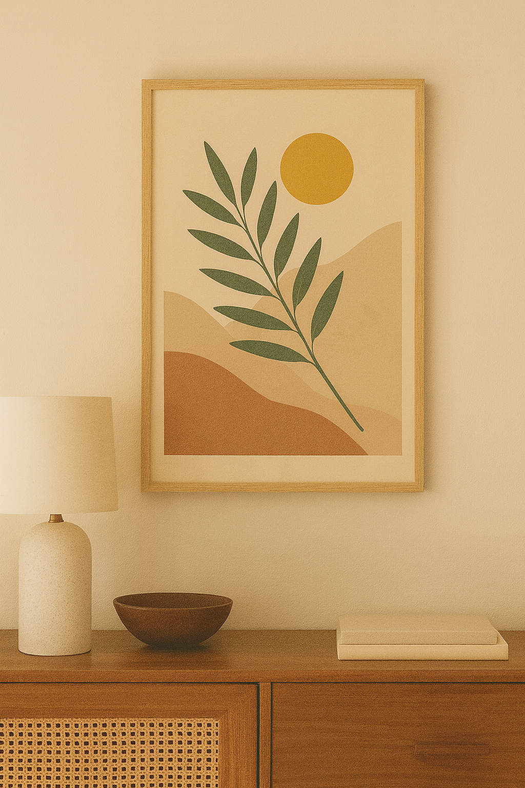 A serene mid-century inspired design featuring a leafy branch set against flowing terracotta hills and a golden sun. The warm earthy palette — ochre, terracotta, and soft beige — captures the essence of Mediterranean calm and timeless natural beauty. Perfect for dining rooms, bedrooms, or cozy living spaces, this poster creates an atmosphere of warmth, light, and balance.