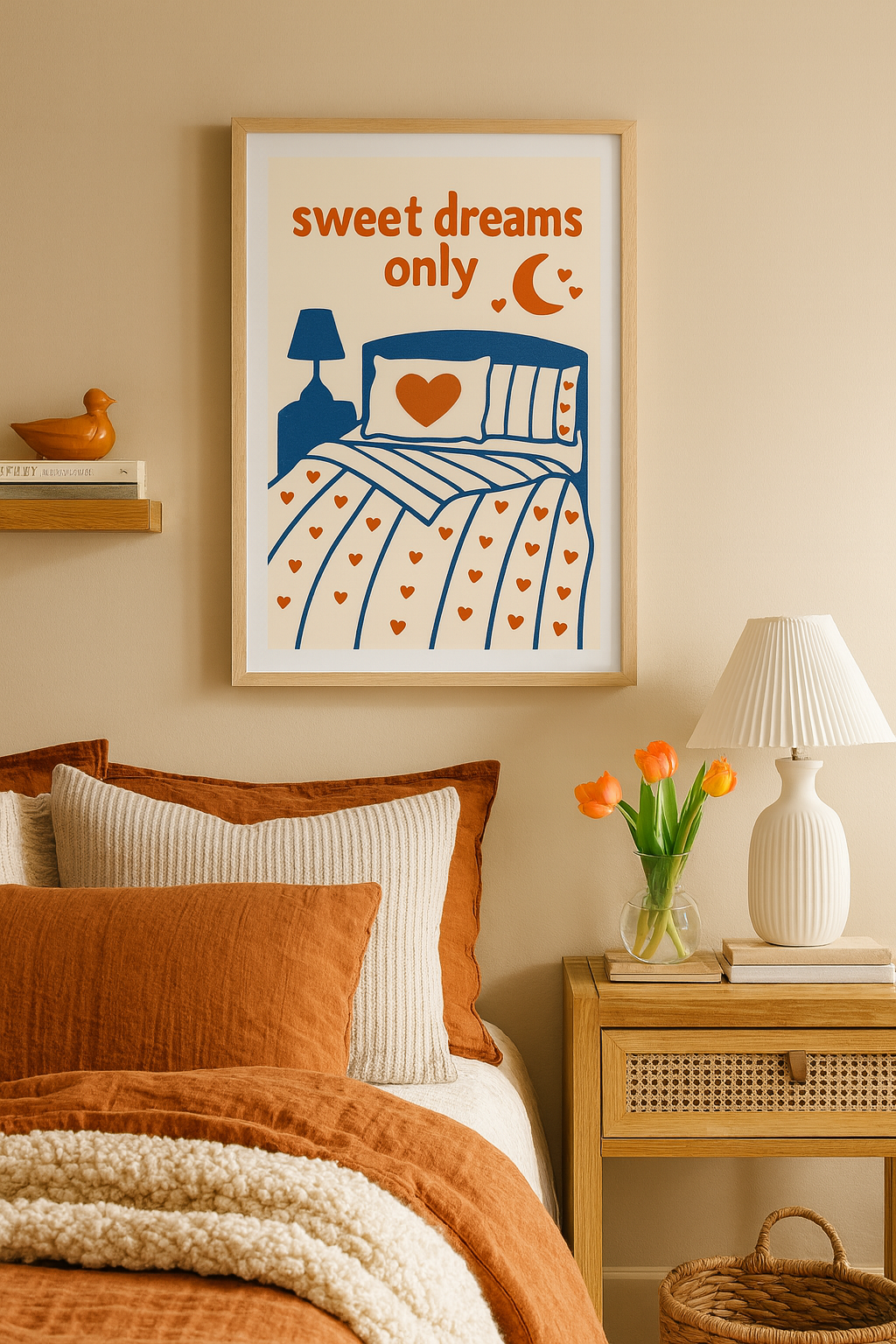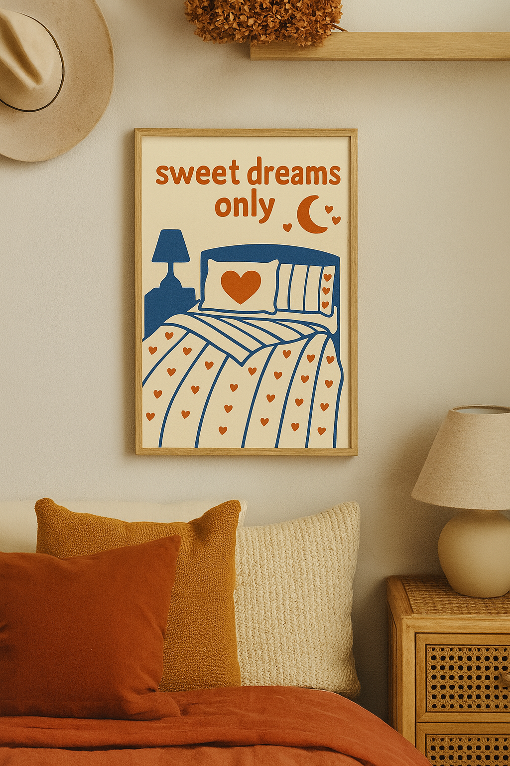 Drift into the coziest nights with this romantic “Sweet Dreams Only” poster, perfect for adding love and warmth to your bedroom. With soft minimalist lines, gentle orange hearts, and calming blue accents, this piece creates a dreamy atmosphere where comfort and connection take center stage. Ideal for bedrooms or as a heartfelt gift, it’s a reminder that every night can end in love and every morning can start with a smile.