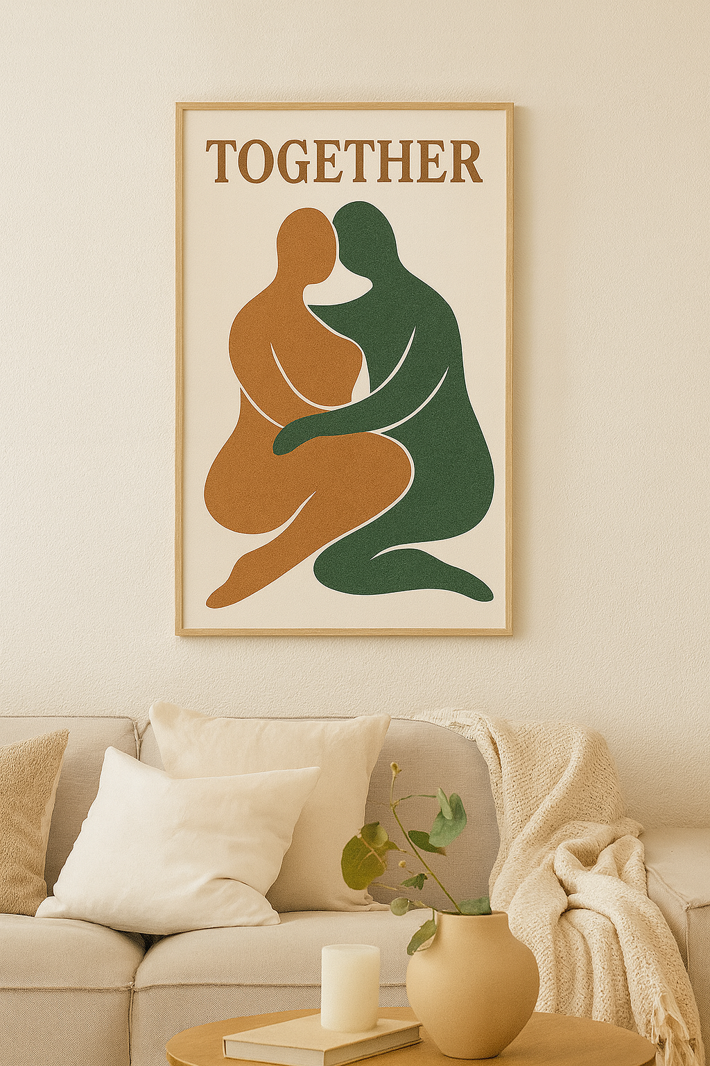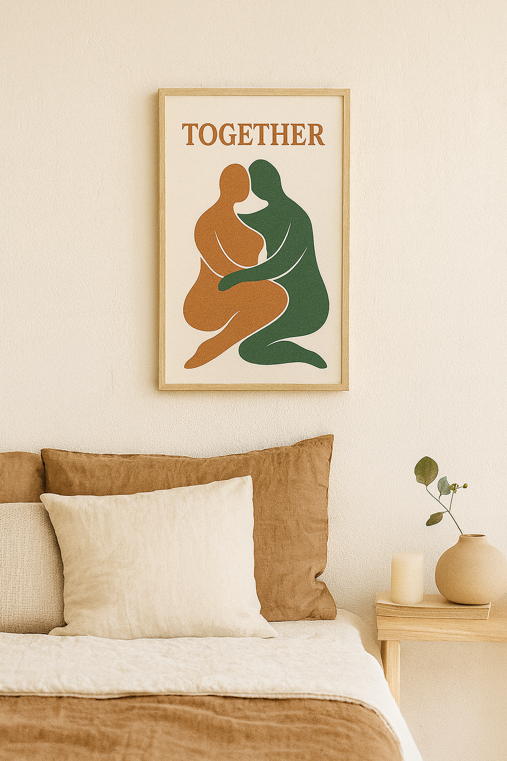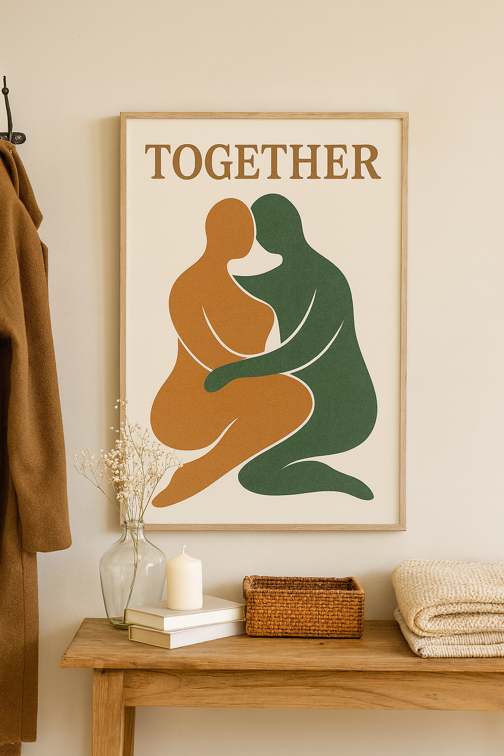 Celebrate connection and intimacy with this minimalist βTOGETHERβ poster. The earthy terracotta and deep green tones bring warmth and balance, making it a timeless piece for modern, Scandinavian, or Japandi-inspired interiors. Perfect for adding a touch of quiet romance to your space.