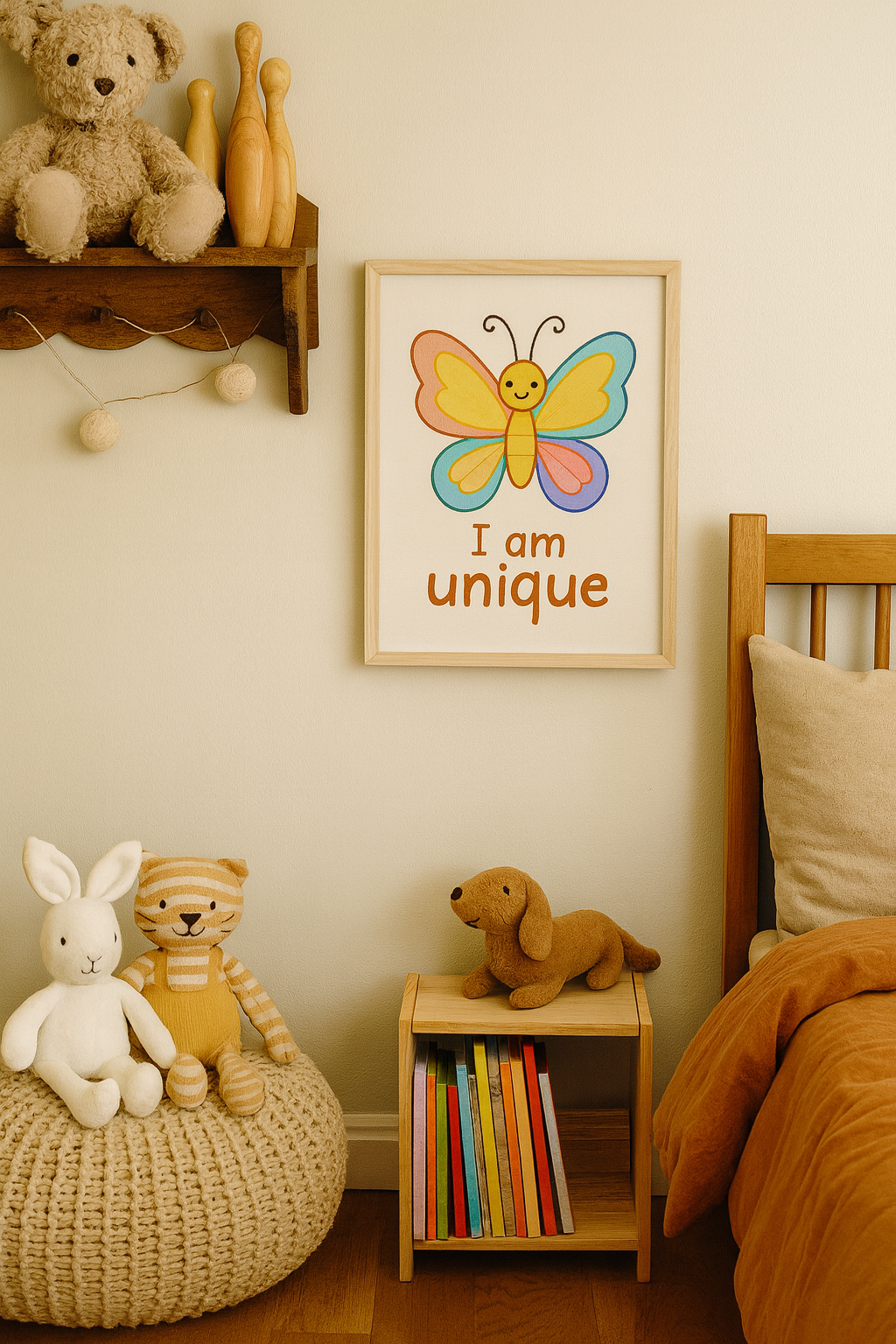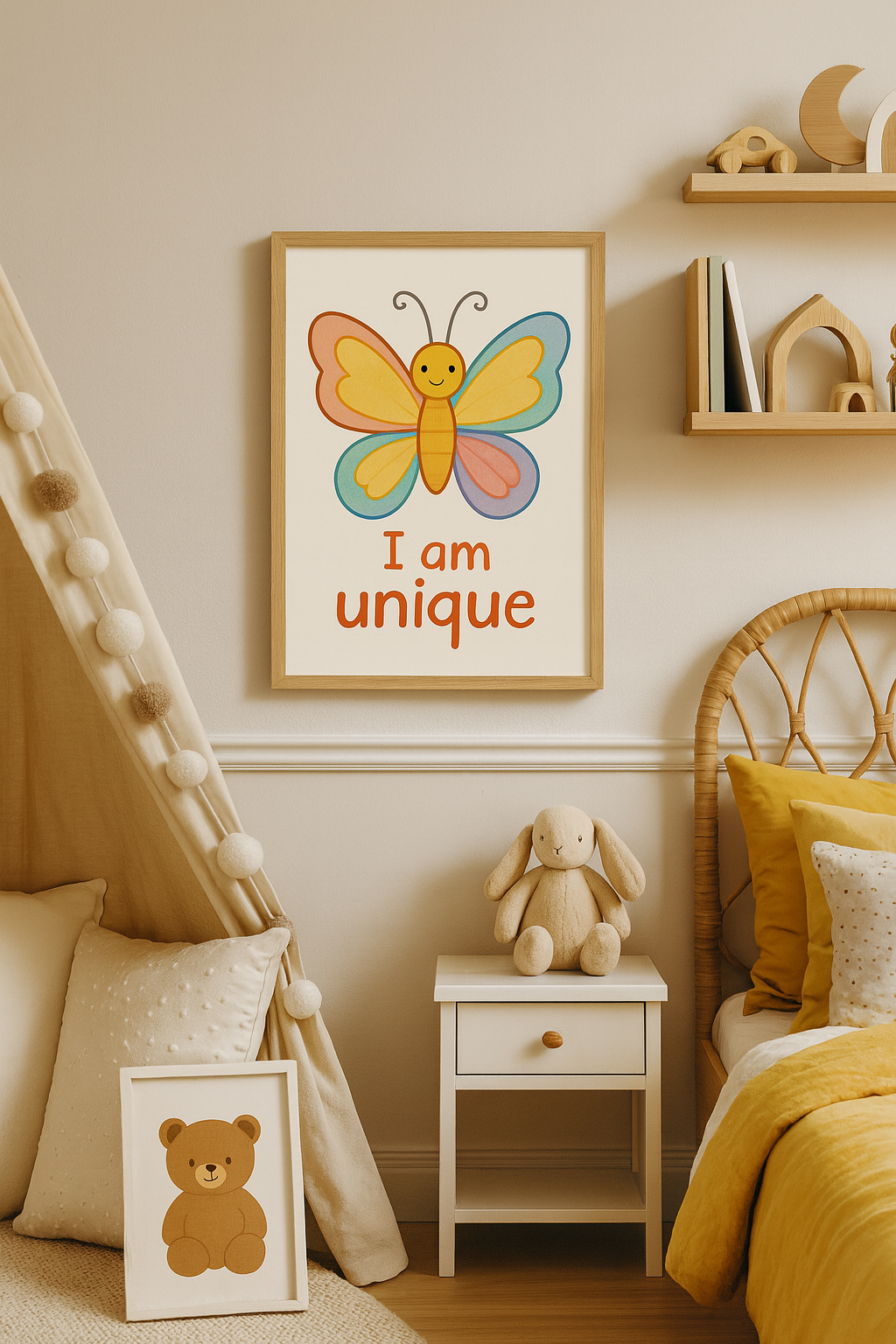 Celebrate individuality with this vibrant “I am unique” poster! Featuring a colorful, smiling butterfly, this cheerful design is perfect for nurseries, playrooms, or classrooms. It’s more than just décor — it’s a daily reminder for kids that their uniqueness is their greatest strength, encouraging confidence and self-love.