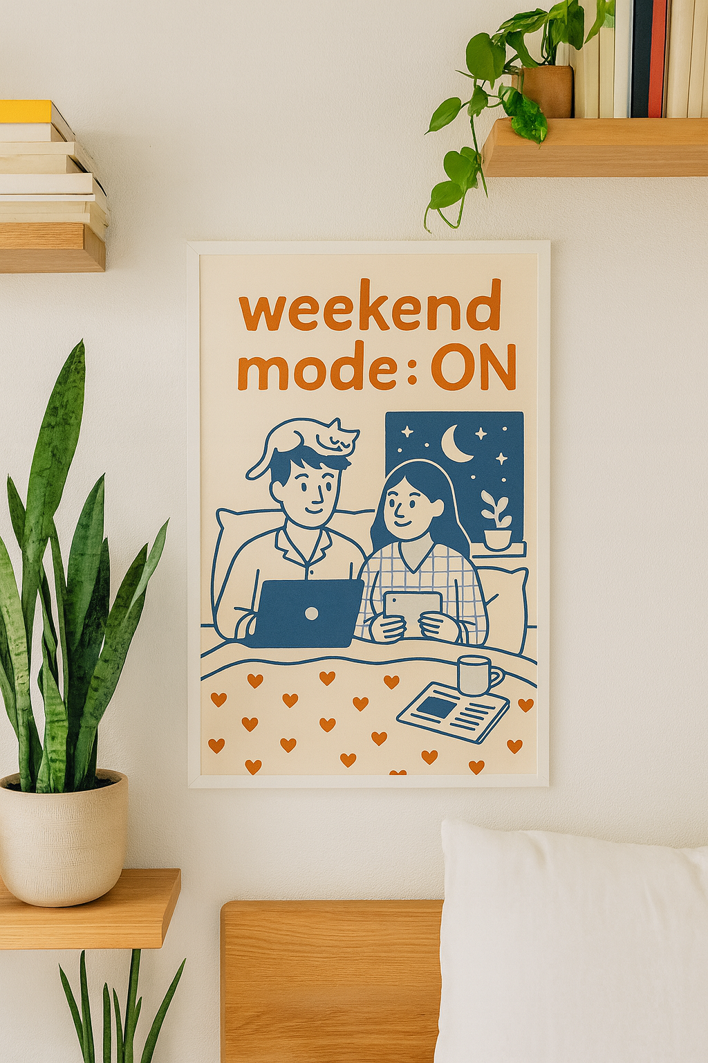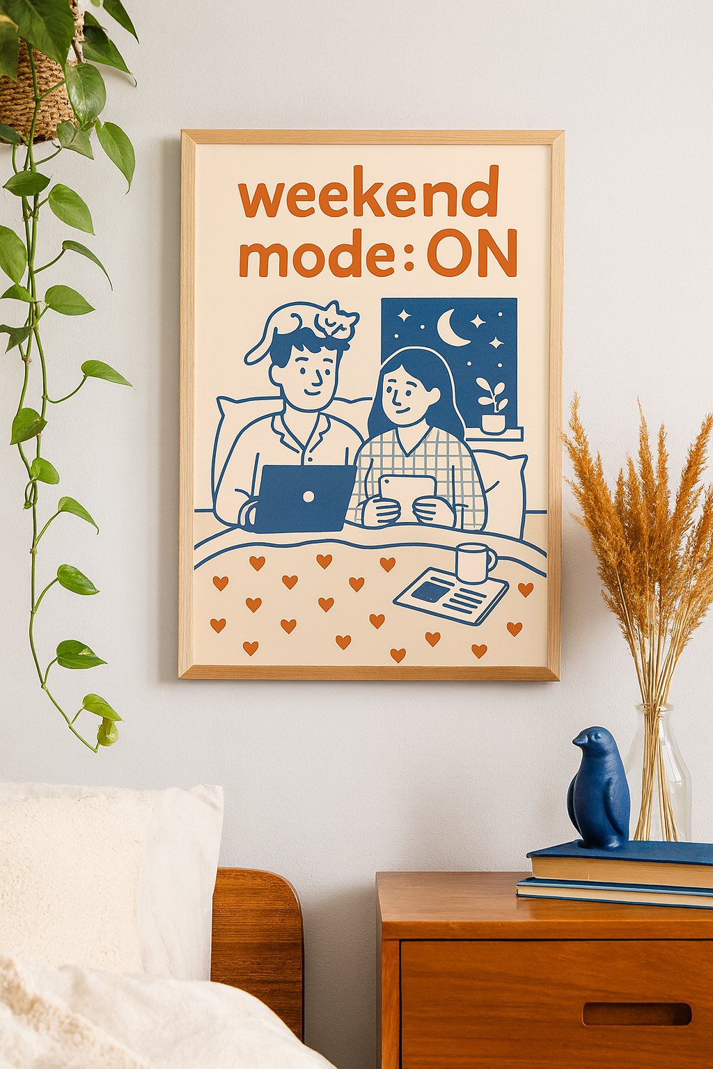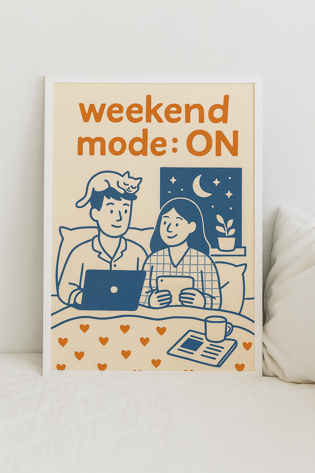 Turn your weekends into pure comfort with the “Weekend Mode: ON” digital poster. Featuring a cozy couple with their cat, coffee, and screens, this modern and minimalist design perfectly captures those quiet, happy moments at home. Ideal for bedrooms, living spaces, or even your home office, it’s a daily reminder to slow down and enjoy life together.