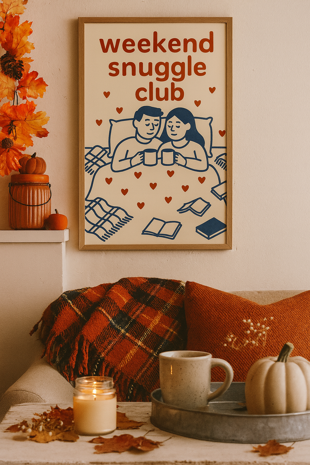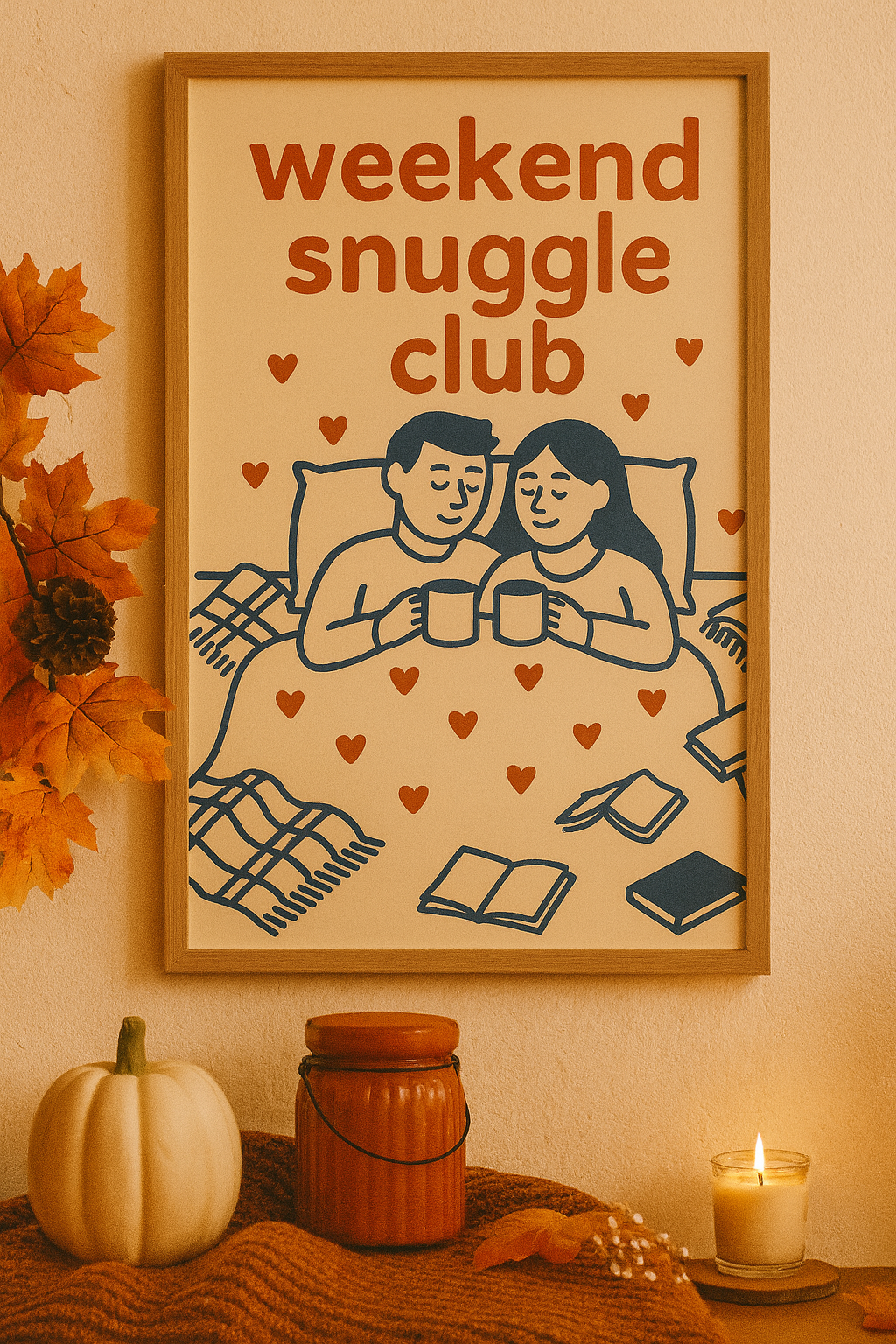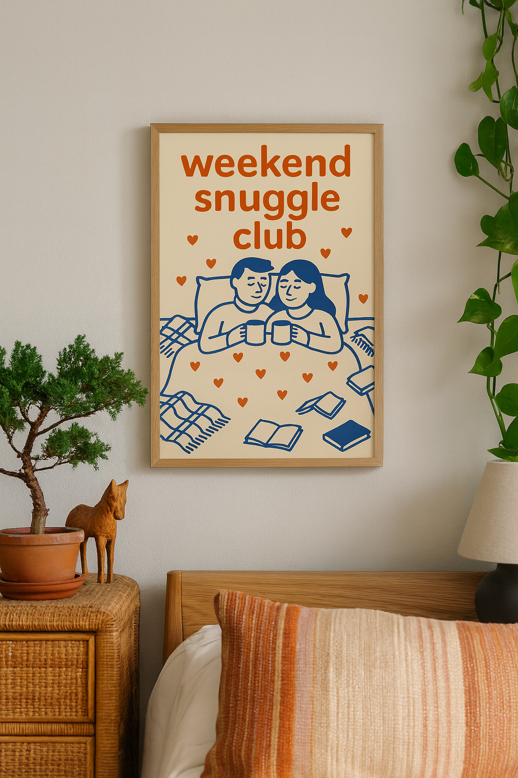 Turn your weekends into a celebration of love and coziness with this “Weekend Snuggle Club” digital poster. Featuring a couple enjoying warm drinks under the covers, surrounded by books, soft blankets, and sweet orange hearts, this artwork perfectly captures the comfort and intimacy of quiet, slow mornings together. Ideal for your bedroom or as a heartfelt gift, this print is a reminder that love is found in the little, cozy rituals you share.