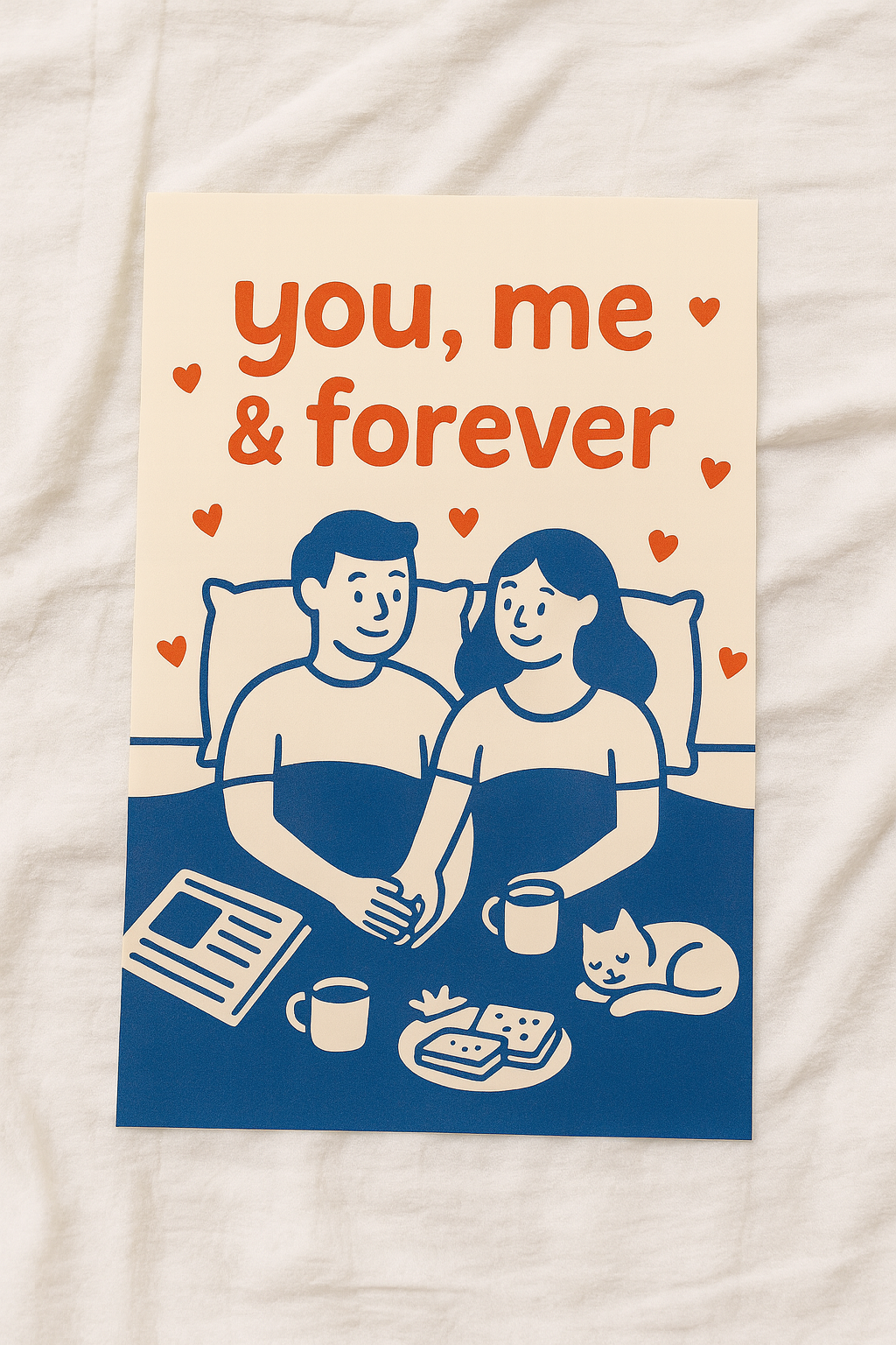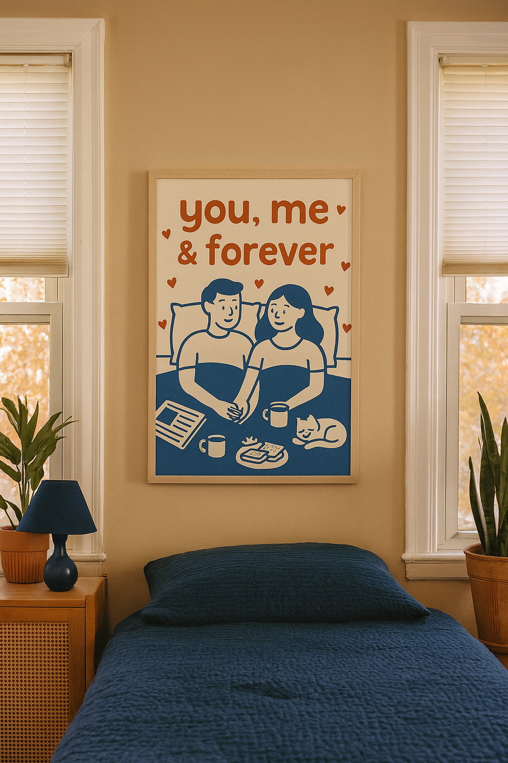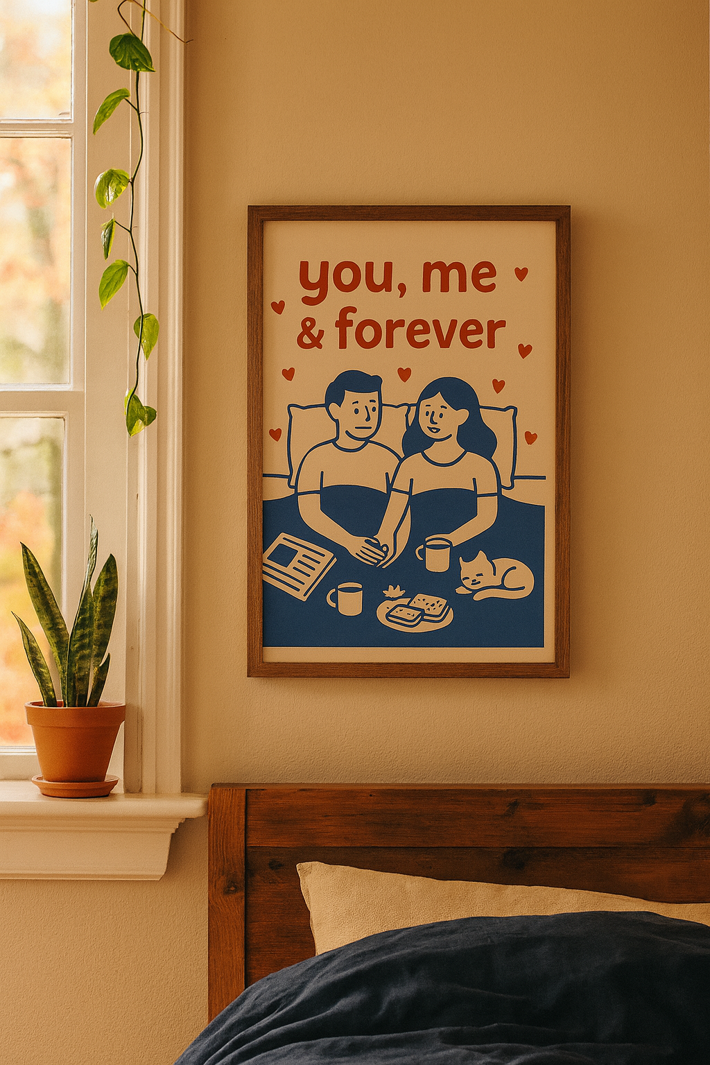 Celebrate love that lasts with this “You, Me & Forever” digital poster. Featuring a cozy couple holding hands in bed, enjoying a quiet morning with coffee, breakfast, and their sleeping cat, this artwork is the perfect blend of romance and comfort. Minimalist and heartfelt, it’s ideal for your bedroom or as a thoughtful gift for someone special.